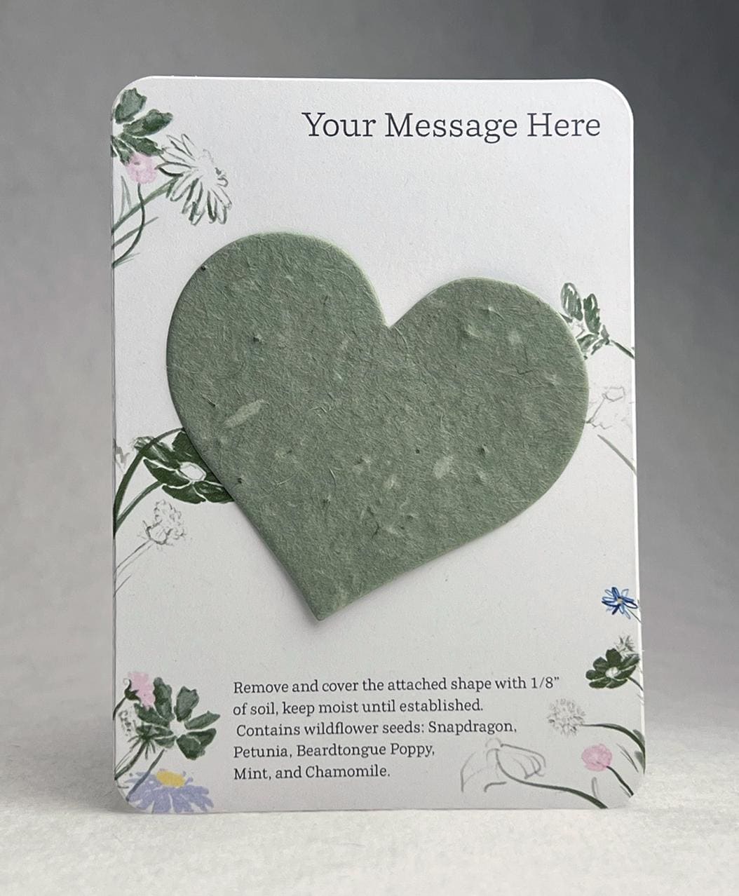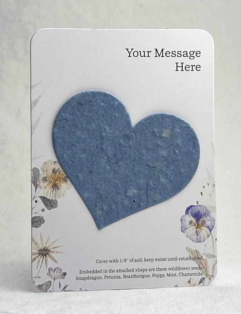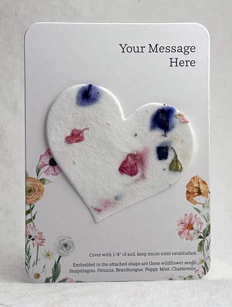The backing card is made of 100% recycled cardstock. The top will be printed with your personal message. The bottom has a note to direct the recipient on how to plant the attached heart shape, as well as a seed list. These are blank on the back. Choose your print style and seed paper color.