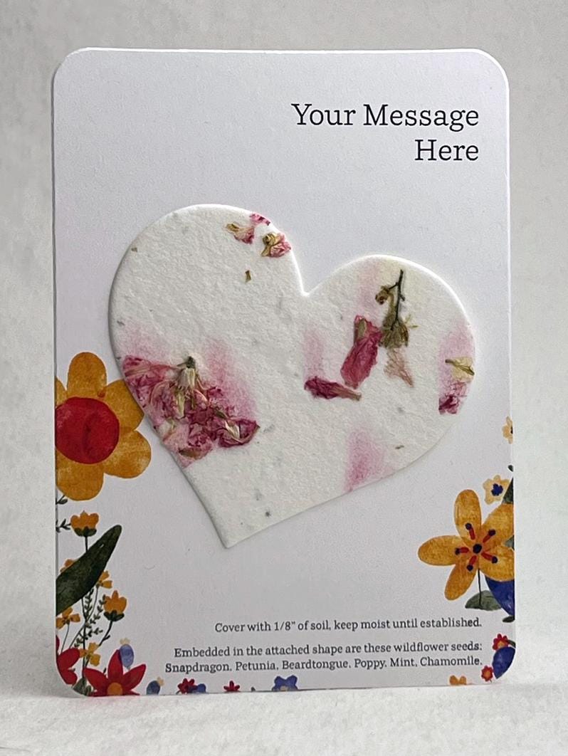 Set of 8 cards, with attached heart shaped seed paper. The heart is made of 100% tree free handmade paper that contains seeds and will sprout flowers if planted.