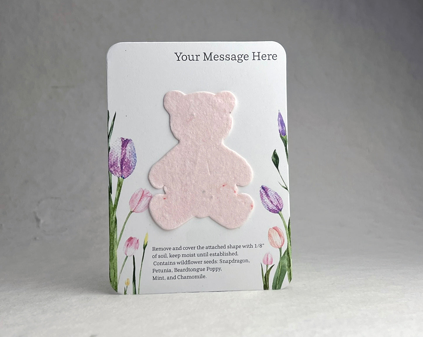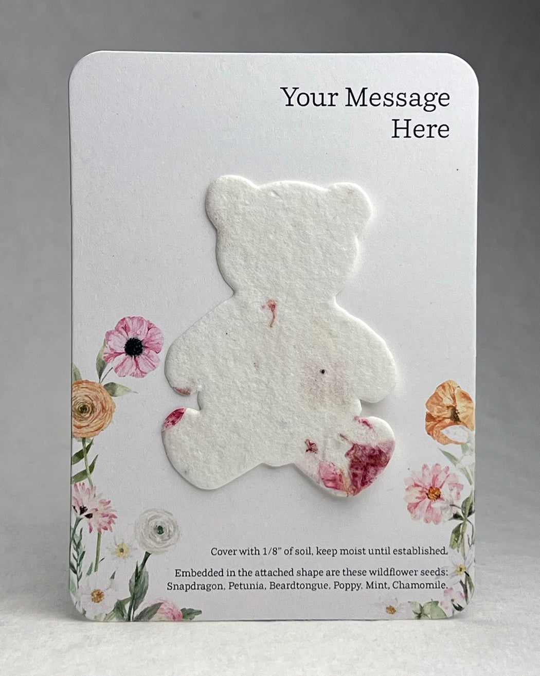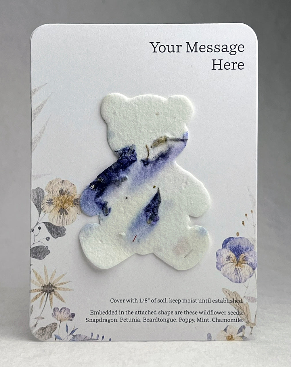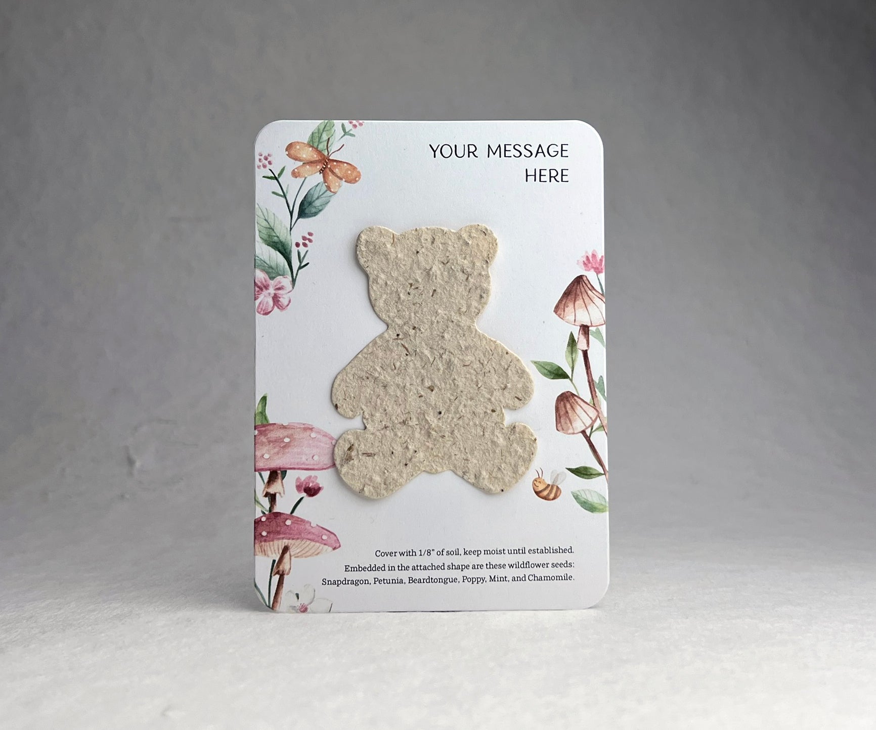 The backing card is made of 100% recycled cardstock. The bottom has a note to direct the recipient on how to plant the attached butterfly shape, as well as a seed list. These are blank on the back.