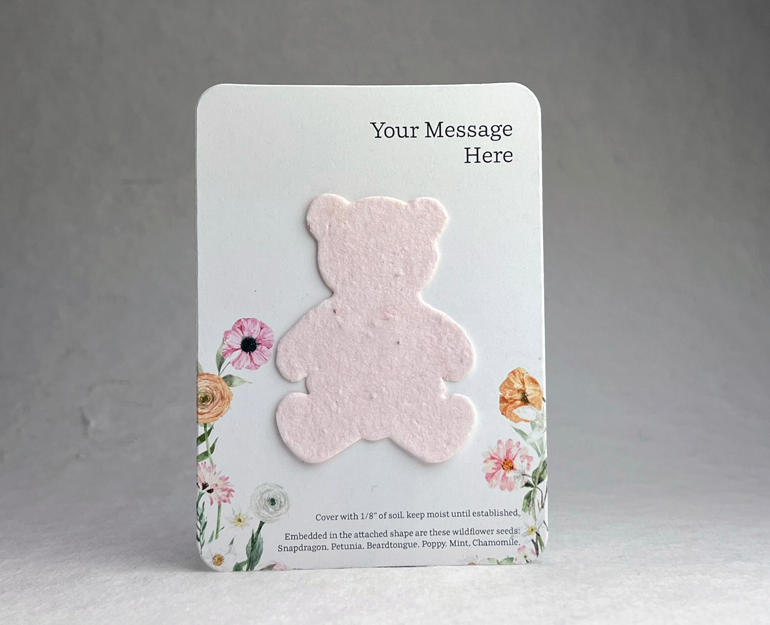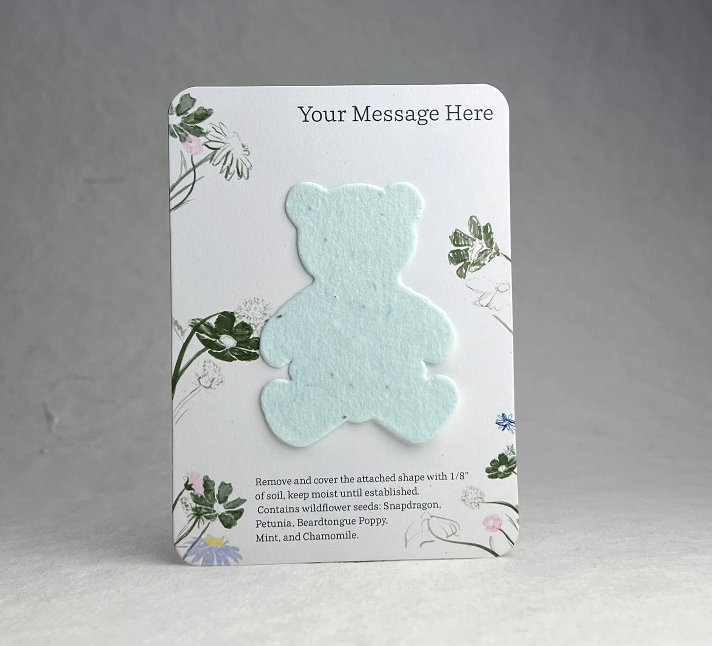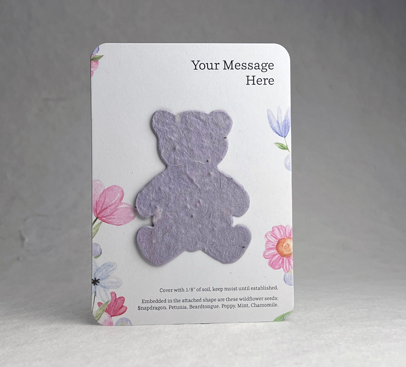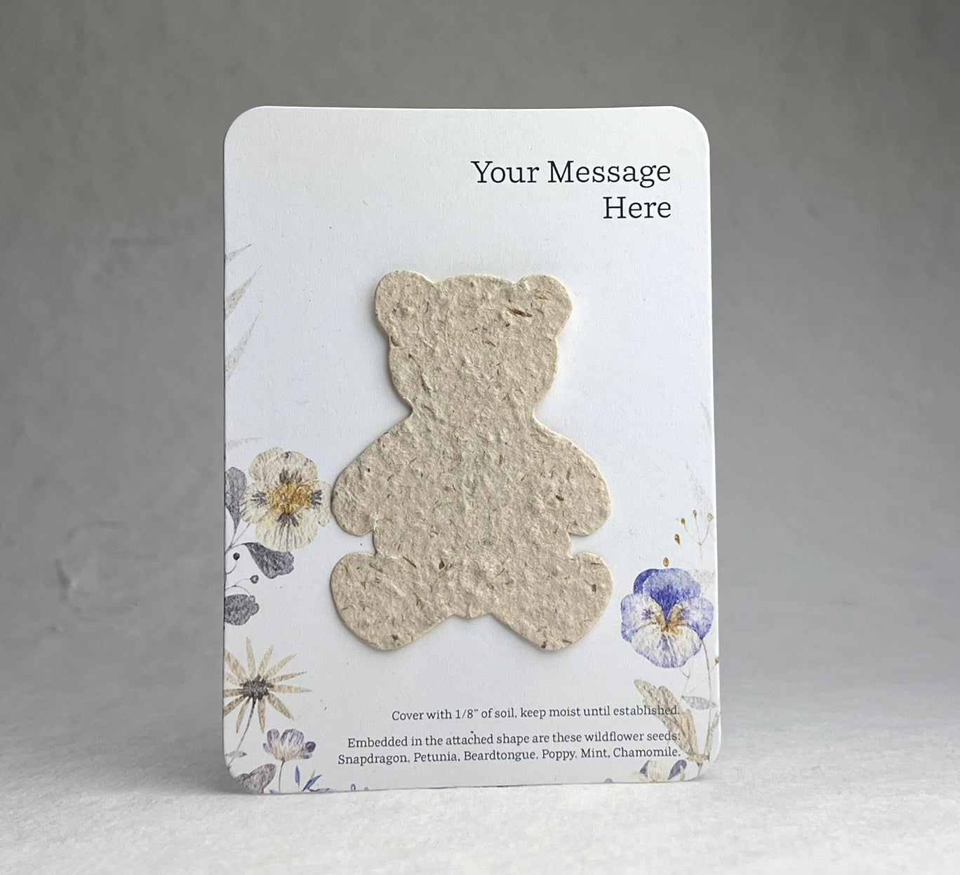 The backing card is made of 100% recycled cardstock. The bottom has a note to direct the recipient on how to plant the attached butterfly shape, as well as a seed list. These are blank on the back.
