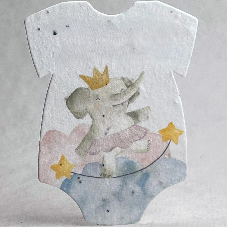 Set of 18 infant bodysuit shaped seed paper, custom printed with baby name. 100% tree free cotton. Will sprout flowers if planted.