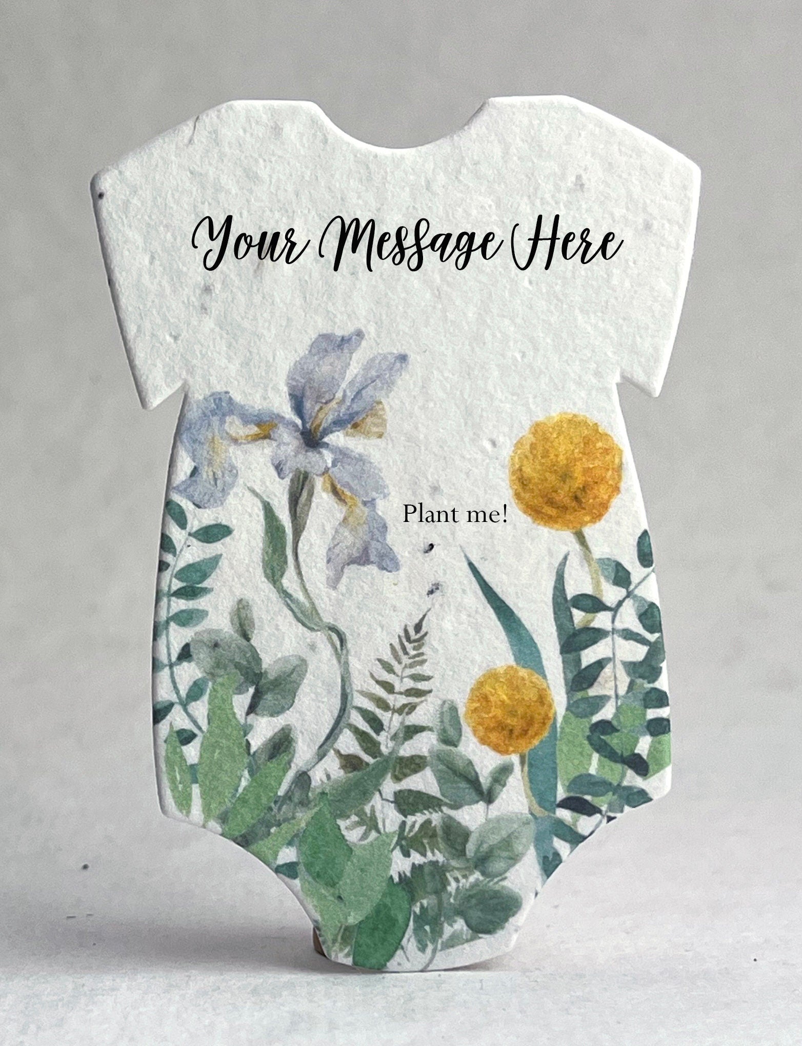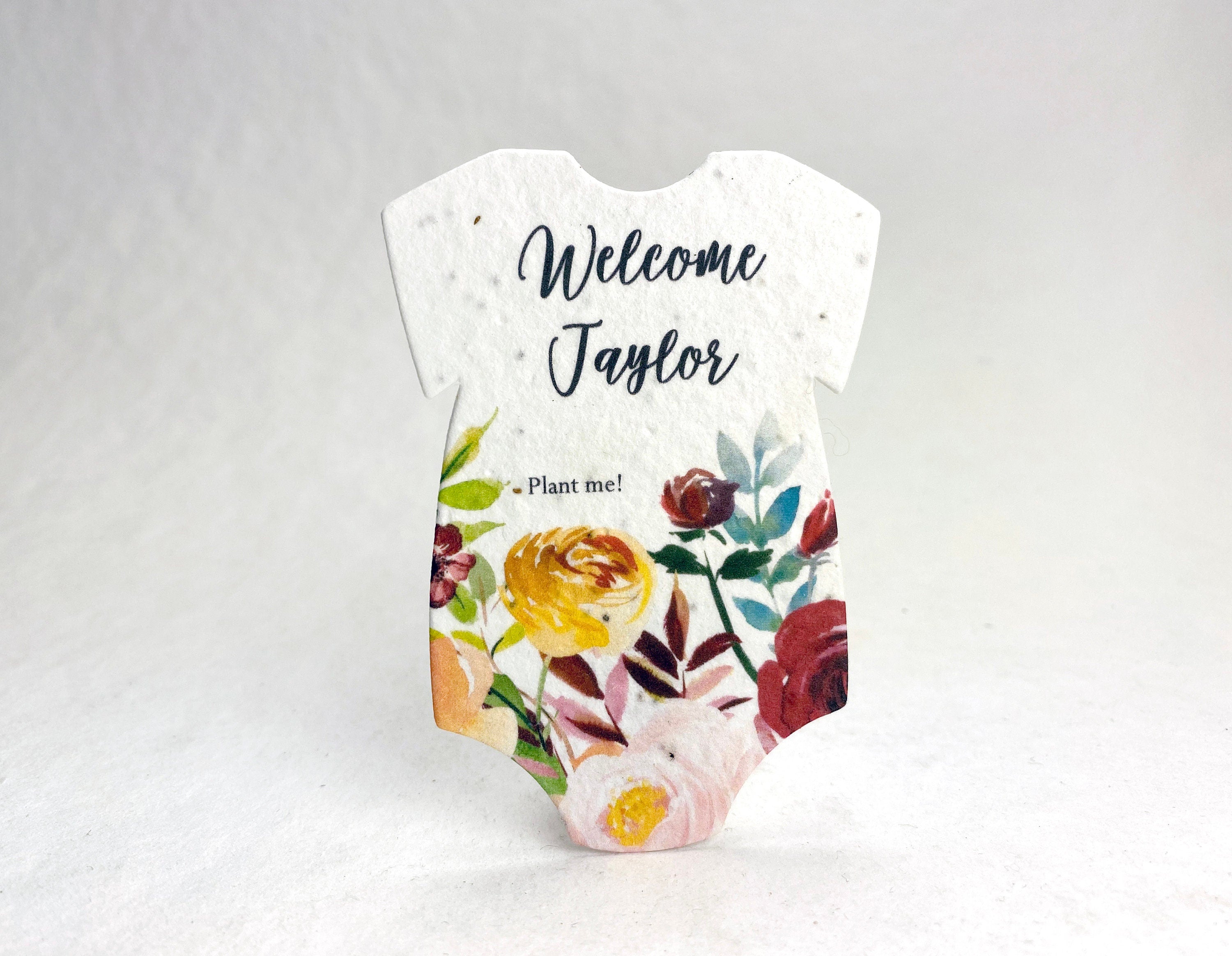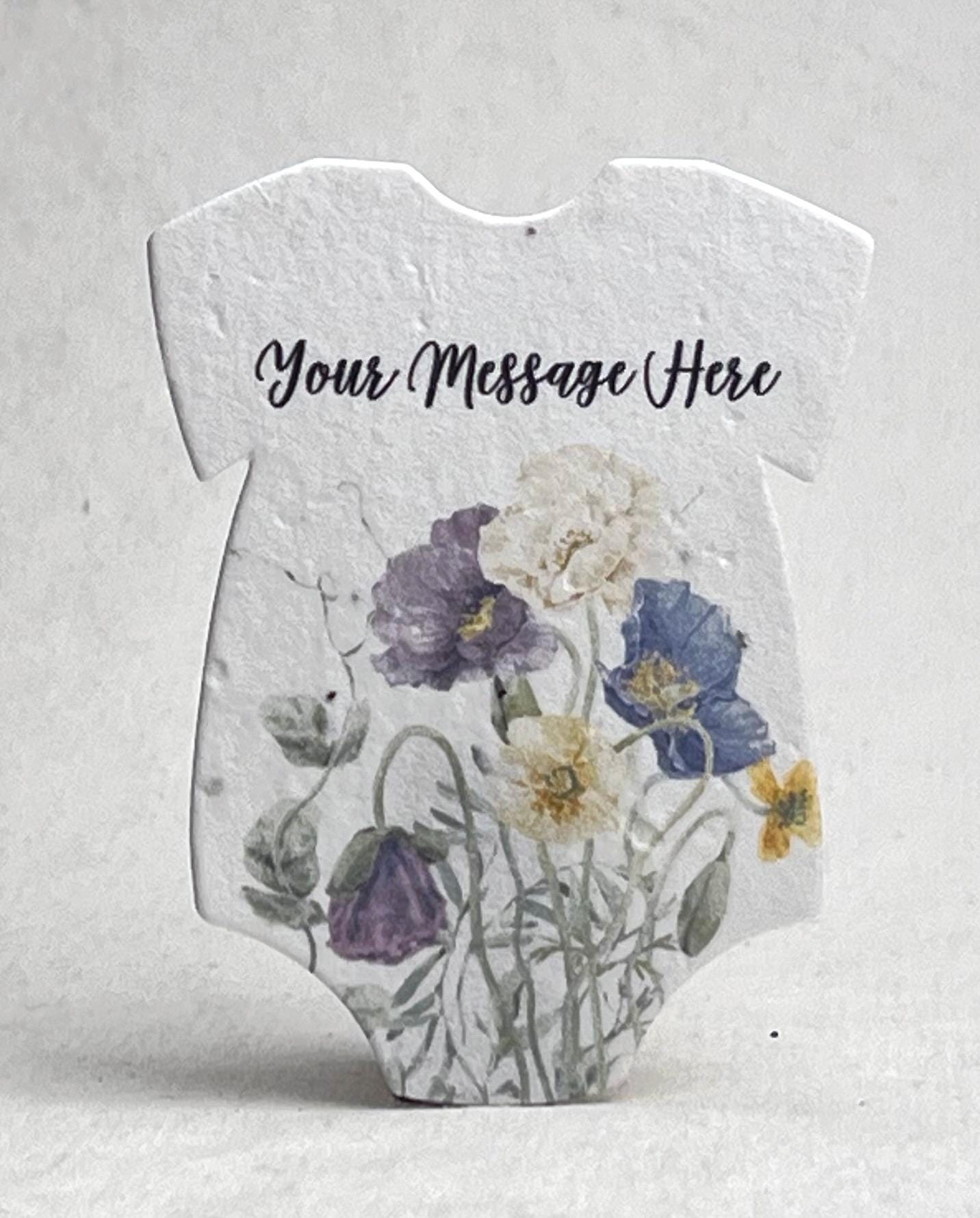 Set of 18 onesie shaped seed paper, custom printed with baby name. 100% tree free cotton. Will sprout flowers if planted. These ship within three days of ordering. The onesie will be printed with the text you enter, exactly as you enter it. No proof will be generated. Please contact us if you are interested in a higher level of customization, or if you would like to add one of our stock messages to the reverse side of these onesies (additional costs required). These are die cut from paper made in Seattle, Washington. They measure 3.2" long by 2.5" wide. The seed list and planting instructions are on the packaging. Our wildflower blend papers contain all of the following US origin wildflower seeds: Snapdragon (Annual), Petunia (Annual), Beardtongue (Perennial), Poppy (Annual), Mountain Mint (Perennial), Chamomile (Perennial). The plants tolerate partial shade and need 4 hours a day of direct sunlight. Will grow to about 3'. The blend of seeds we have selected to include in our papers was chosen to ensure that regardless of your growing region some of the plant seeds embedded in our paper will flourish. Germination may begin as quickly as one week or may take up to six weeks depending on your regional growing zone. If you plant this paper in a pot, or in your garden please cover with just 1/8” of soil and keep moist until established.