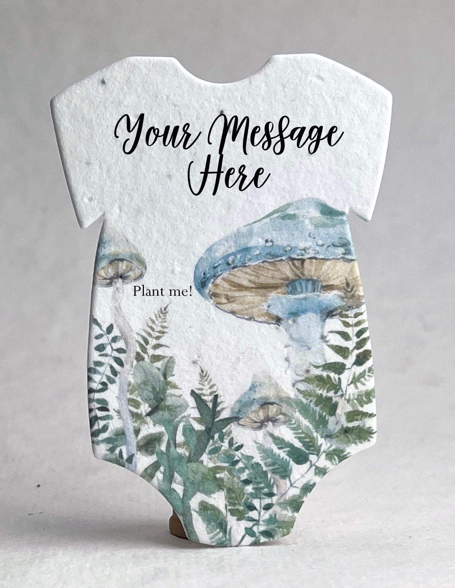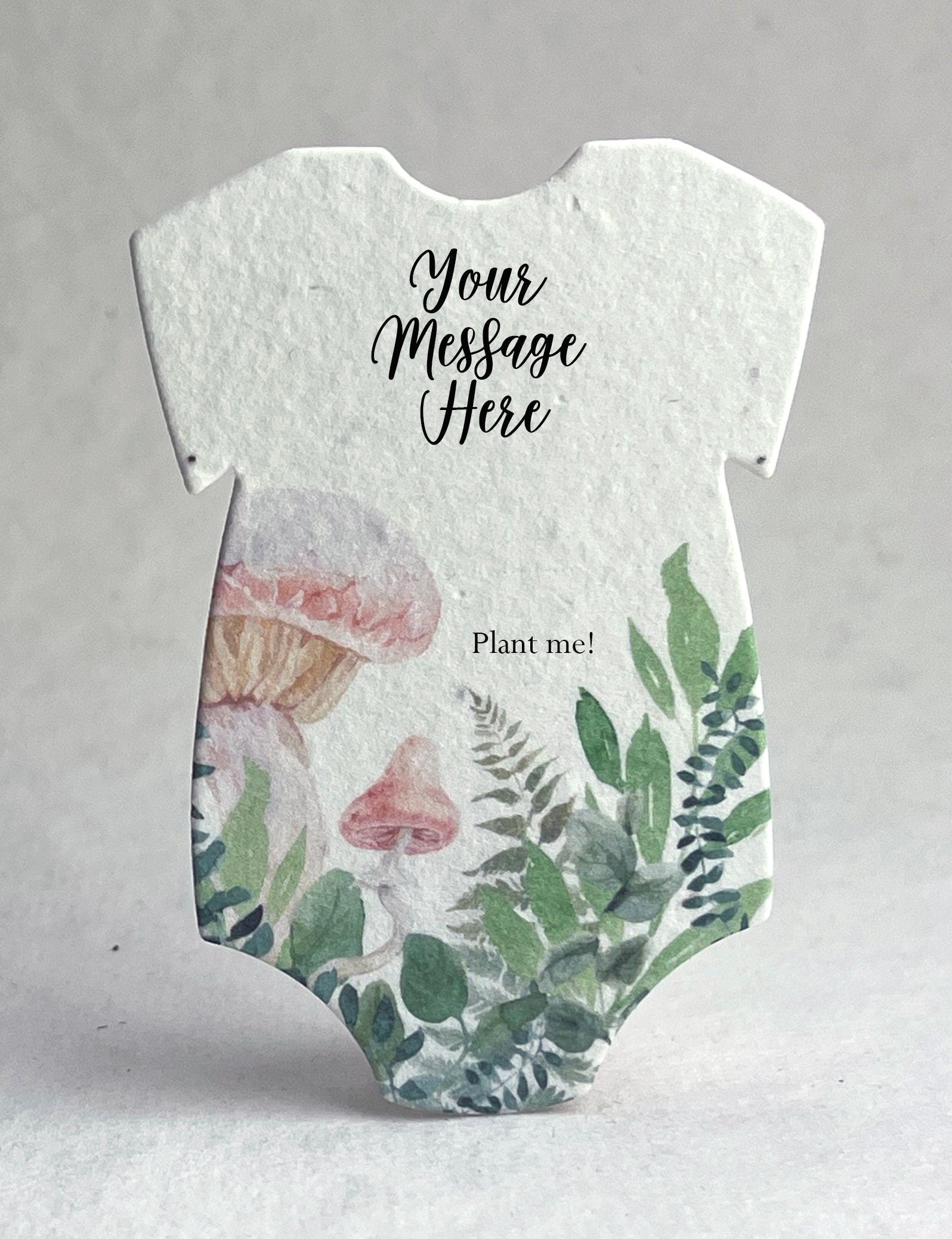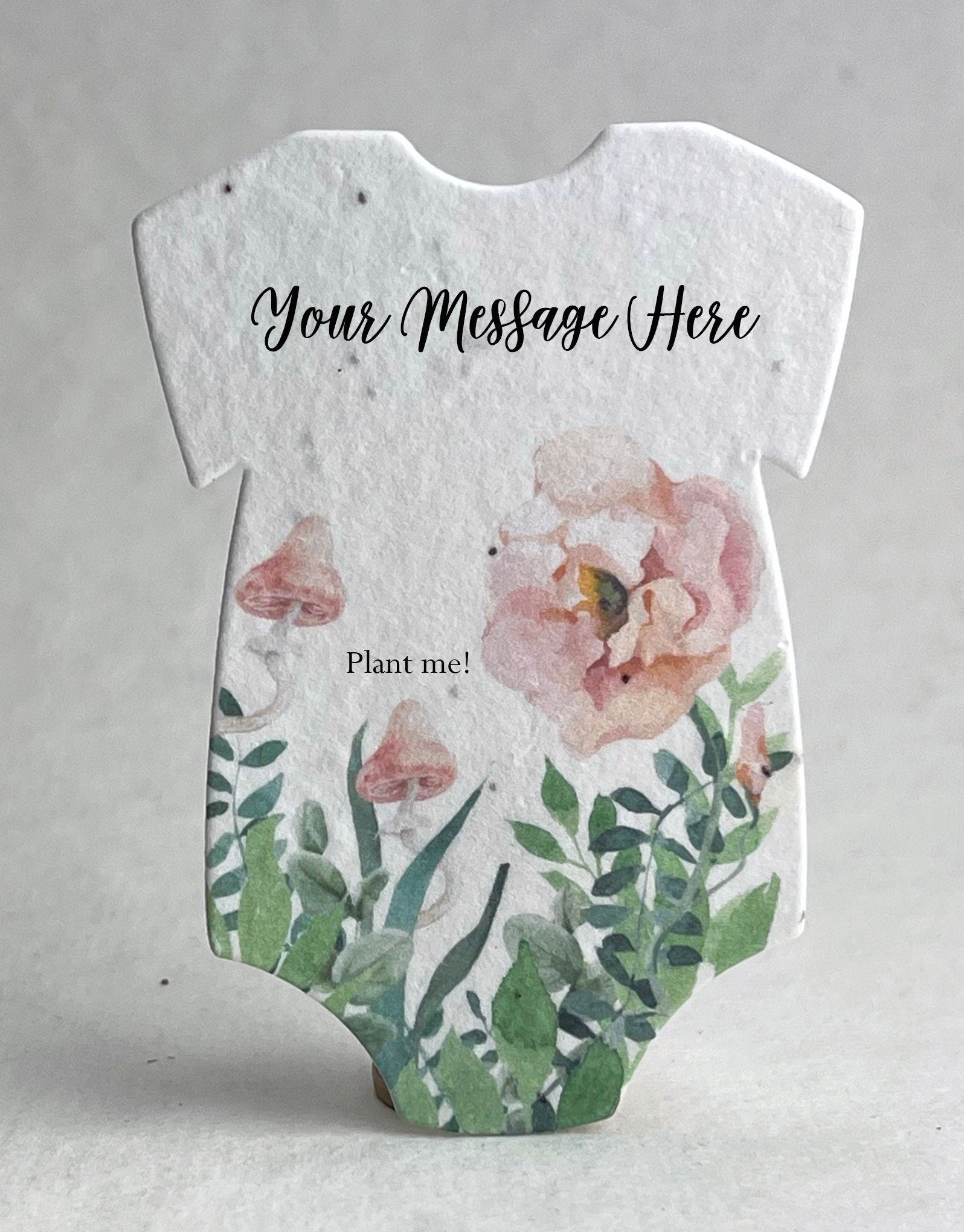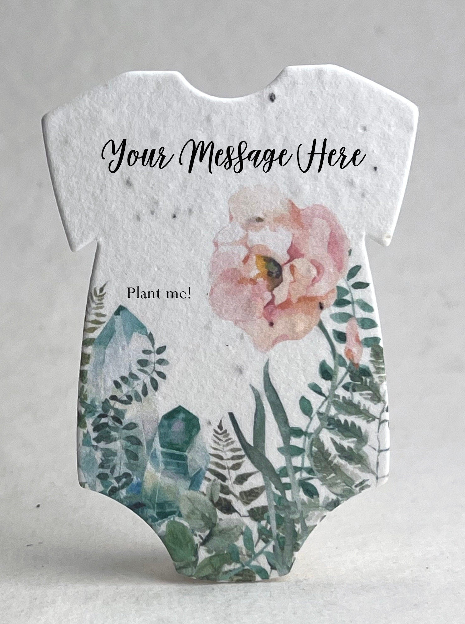 Set of 18 onesie shaped seed paper, custom printed with baby name. 100% tree free cotton. Will sprout flowers if planted. These ship within three days of ordering. The onesie will be printed with the text you enter, exactly as you enter it. No proof will be generated. Please contact us if you are interested in a higher level of customization, or if you would like to add one of our stock messages to the reverse side of these onesies (additional costs required). These are die cut from paper made in Seattle, Washington. They measure 3.2" long by 2.5" wide. The seed list and planting instructions are on the packaging. Our wildflower blend papers contain all of the following US origin wildflower seeds: Snapdragon (Annual), Petunia (Annual), Beardtongue (Perennial), Poppy (Annual), Mountain Mint (Perennial), Chamomile (Perennial). The plants tolerate partial shade and need 4 hours a day of direct sunlight. Will grow to about 3'. The blend of seeds we have selected to include in our papers was chosen to ensure that regardless of your growing region some of the plant seeds embedded in our paper will flourish. Germination may begin as quickly as one week or may take up to six weeks depending on your regional growing zone. If you plant this paper in a pot, or in your garden please cover with just 1/8” of soil and keep moist until established.