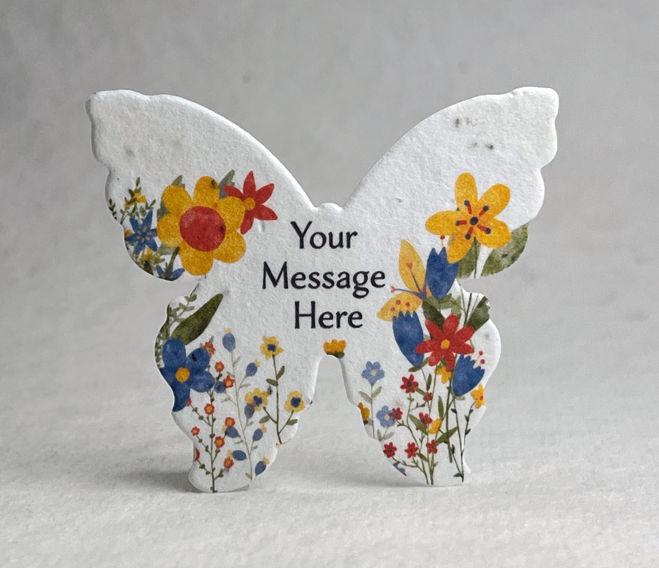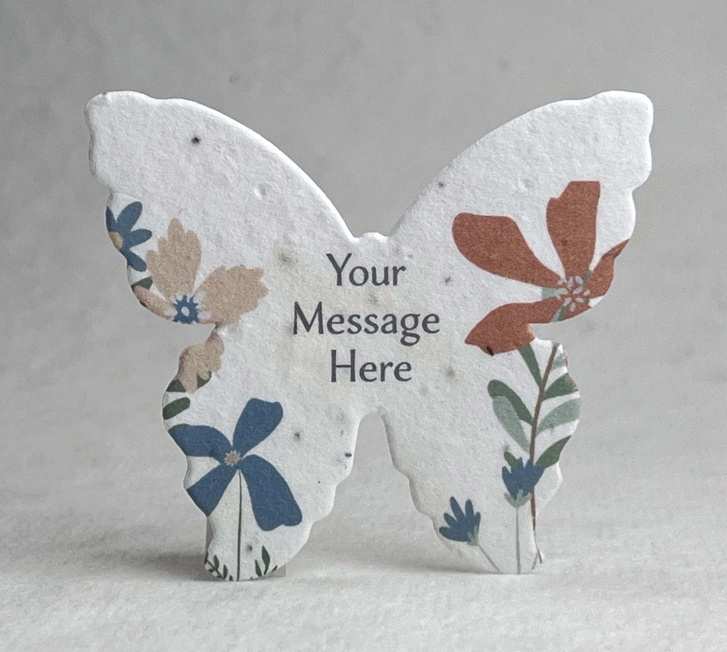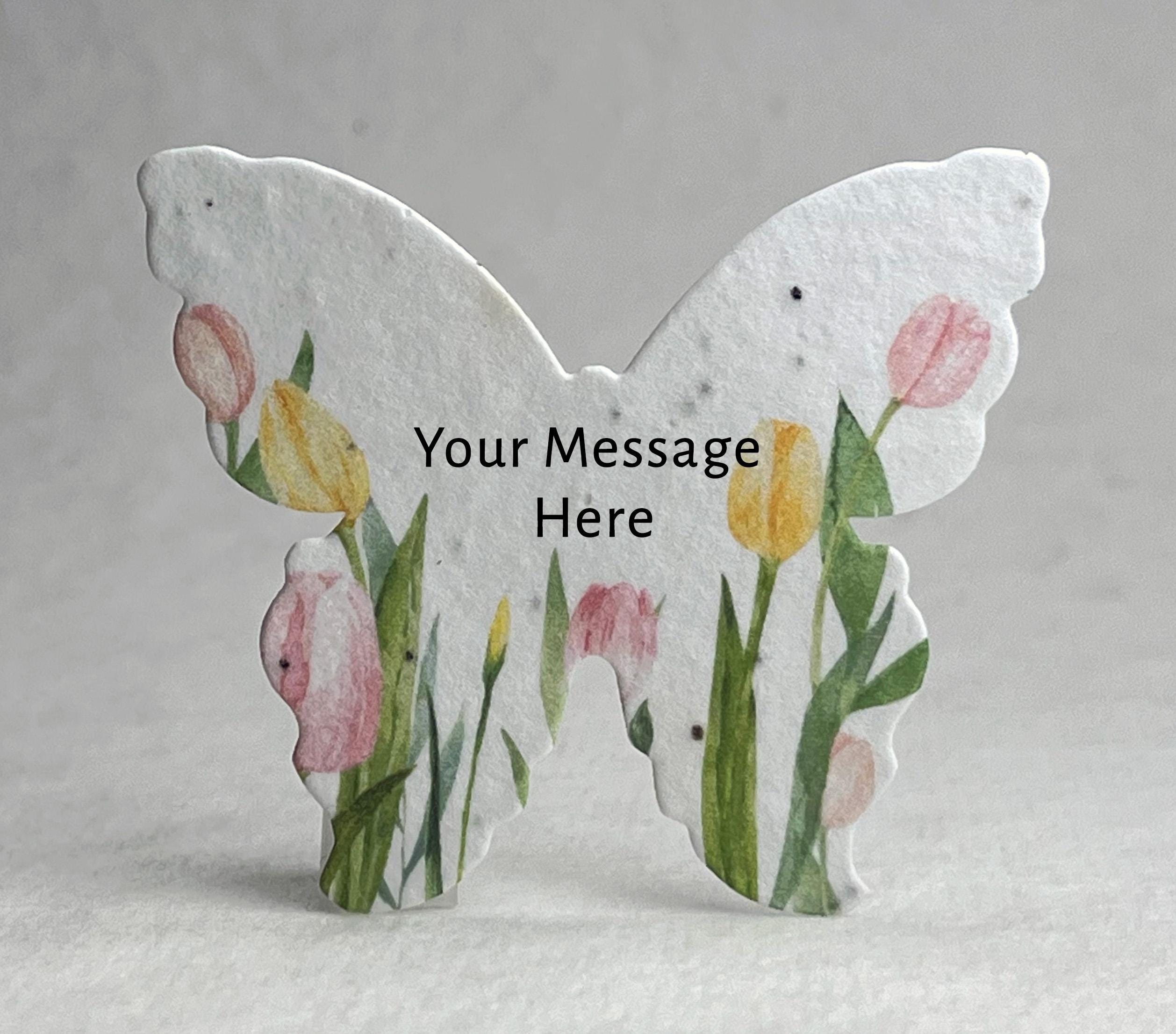 Set of 18 Large Butterfly shaped seed paper printed with your choice of color art and personalized message. 100% tree free cotton paper. Will sprout flowers if planted. These are die cut from paper made in Seattle, Washington. They measure 3" wide by 2.85" tall. Our wildflower blend papers contain all of the following US origin wildflower seeds: Snapdragon (Annual), Petunia (Annual), Beardtongue (Perennial), Poppy (Annual), Mountain Mint (Perennial), Chamomile (Perennial). The plants tolerate partial shade and need 4 hours a day of direct sunlight. Will grow to about 3'. The blend of seeds we have selected to include in our papers was chosen to ensure that regardless of your growing region some of the plant seeds embedded in our paper will flourish. Germination may begin as quickly as one week or may take up to six weeks depending on your regional growing zone. If you plant this paper in a pot, or in your garden please cover with just 1/8” of soil and keep moist until established.