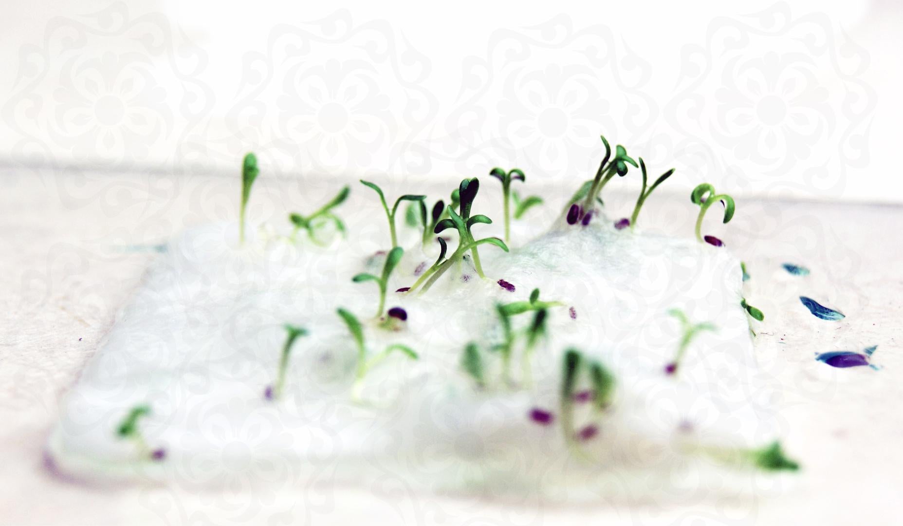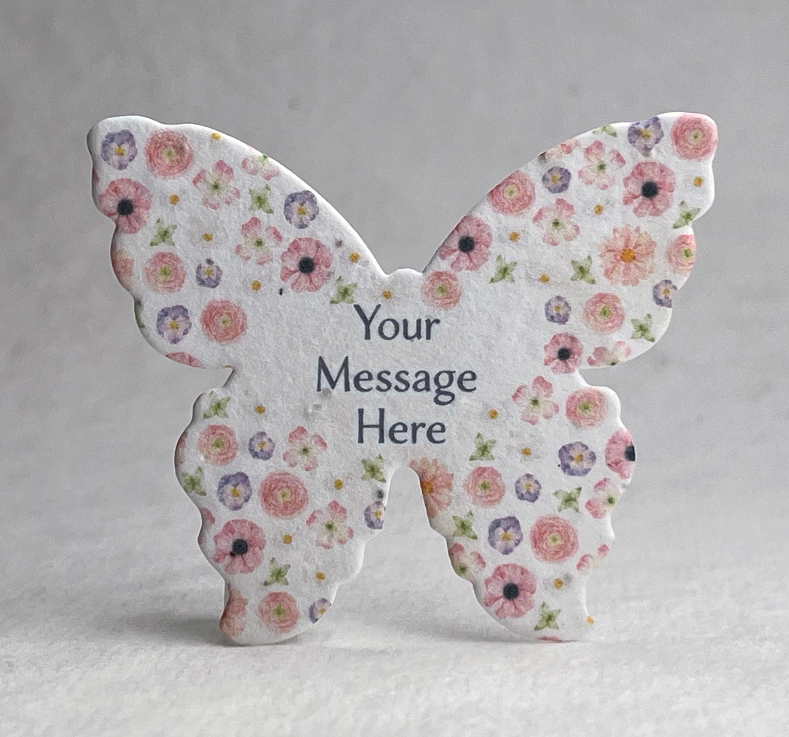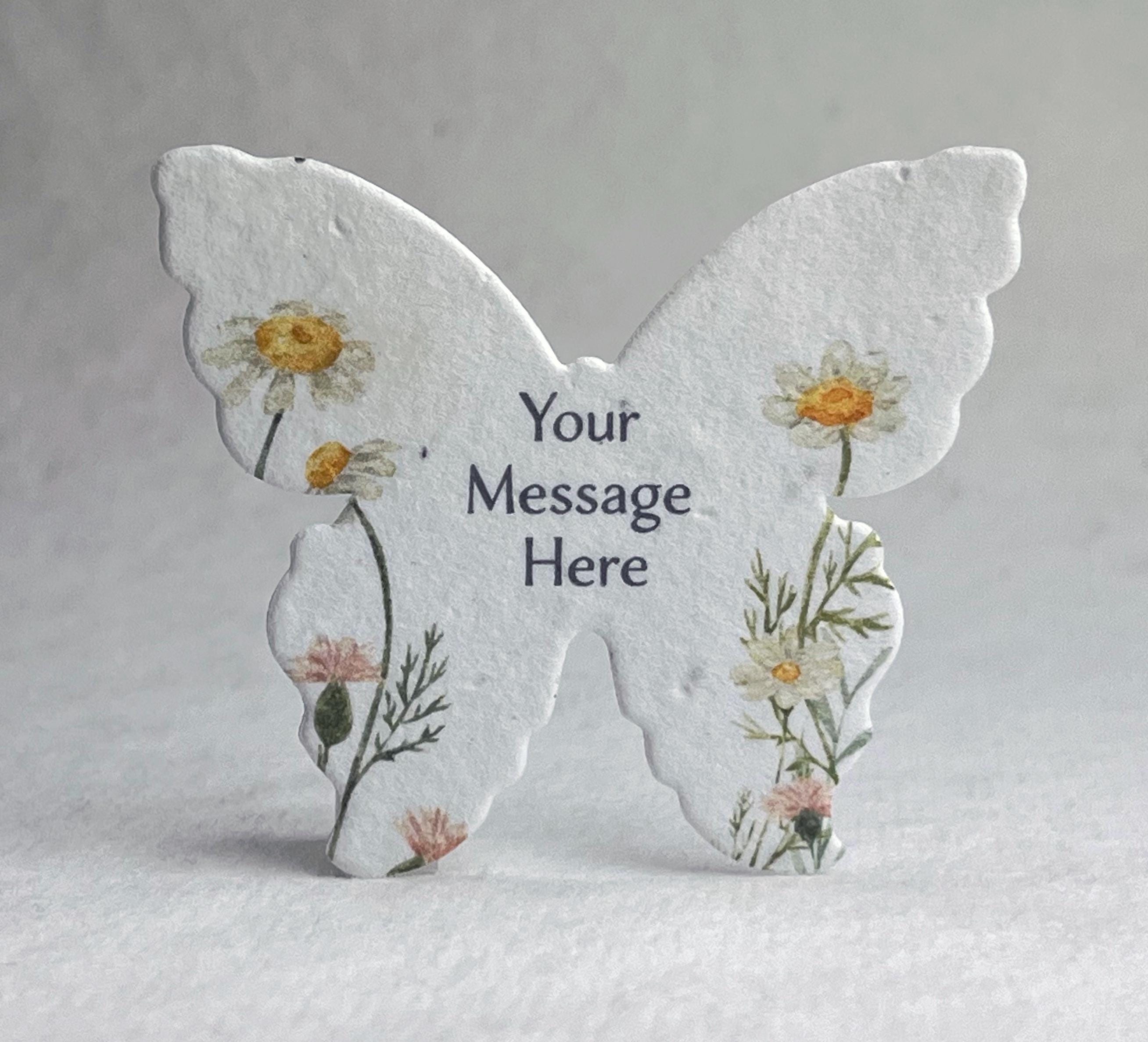 Set of 18 Large Butterfly shaped seed paper printed with your choice of color art and personalized message. 100% tree free cotton paper. Will sprout flowers if planted. These are die cut from paper made in Seattle, Washington. They measure 3" wide by 2.85" tall. Our wildflower blend papers contain all of the following US origin wildflower seeds: Snapdragon (Annual), Petunia (Annual), Beardtongue (Perennial), Poppy (Annual), Mountain Mint (Perennial), Chamomile (Perennial). The plants tolerate partial shade and need 4 hours a day of direct sunlight. Will grow to about 3'. The blend of seeds we have selected to include in our papers was chosen to ensure that regardless of your growing region some of the plant seeds embedded in our paper will flourish. Germination may begin as quickly as one week or may take up to six weeks depending on your regional growing zone. If you plant this paper in a pot, or in your garden please cover with just 1/8” of soil and keep moist until established.