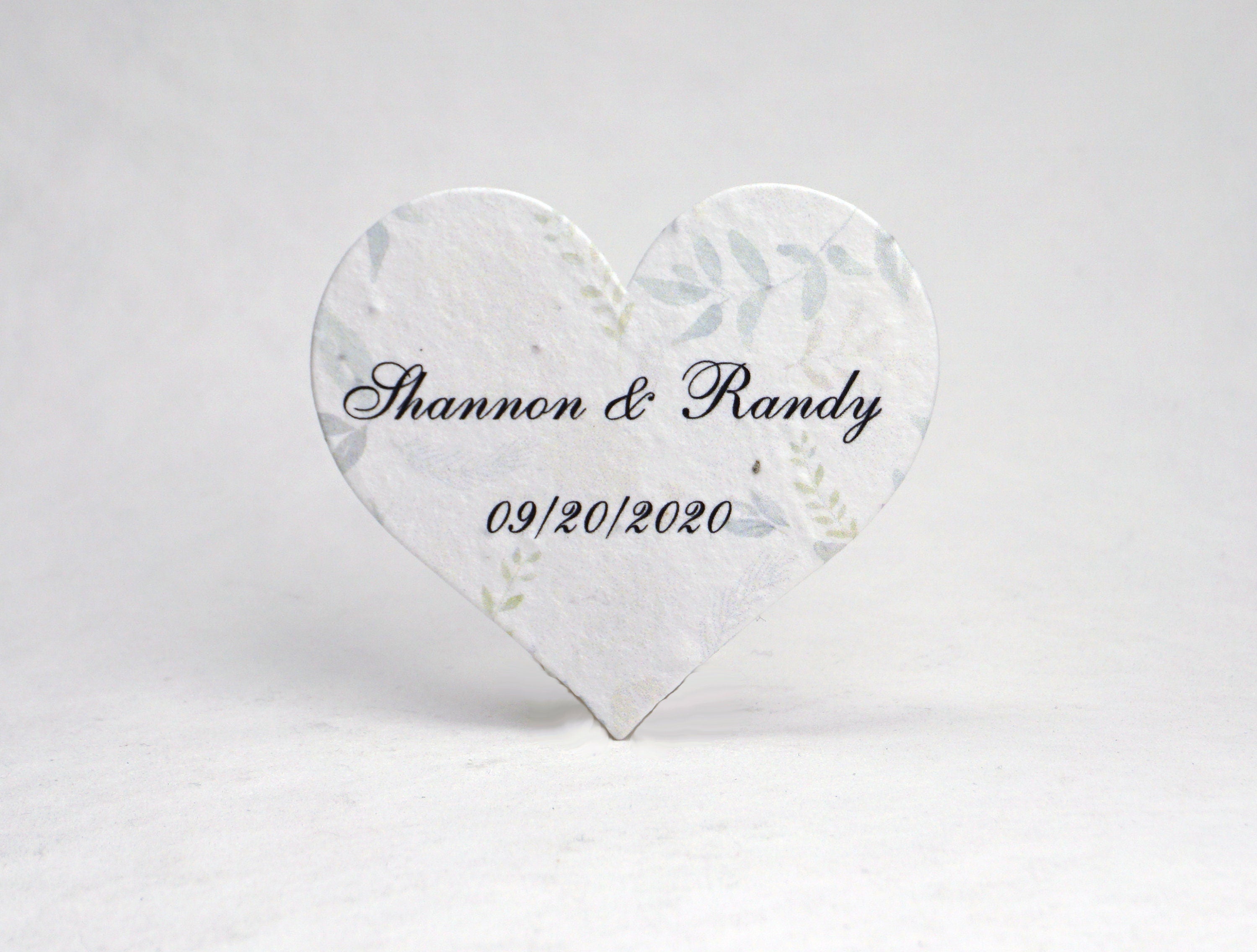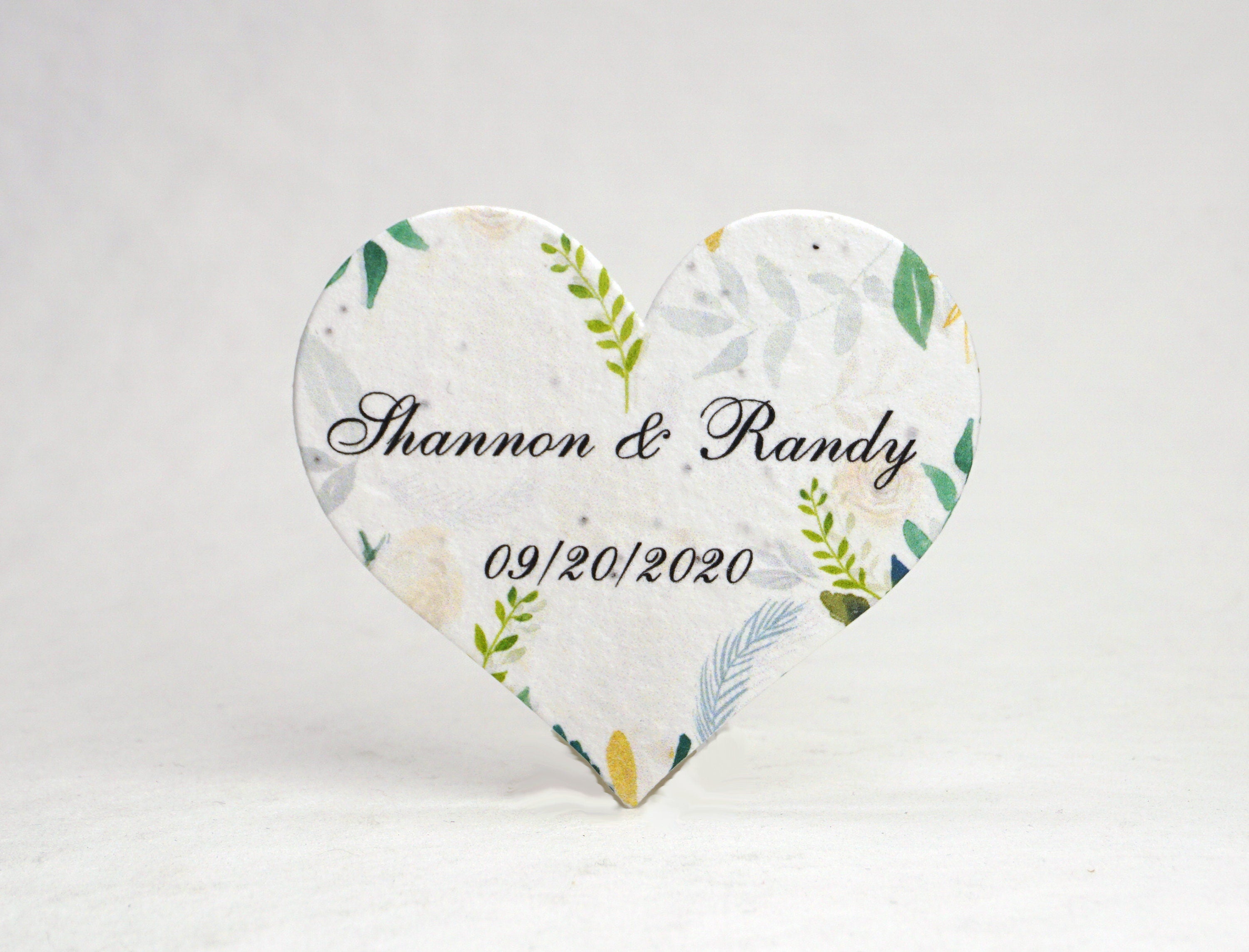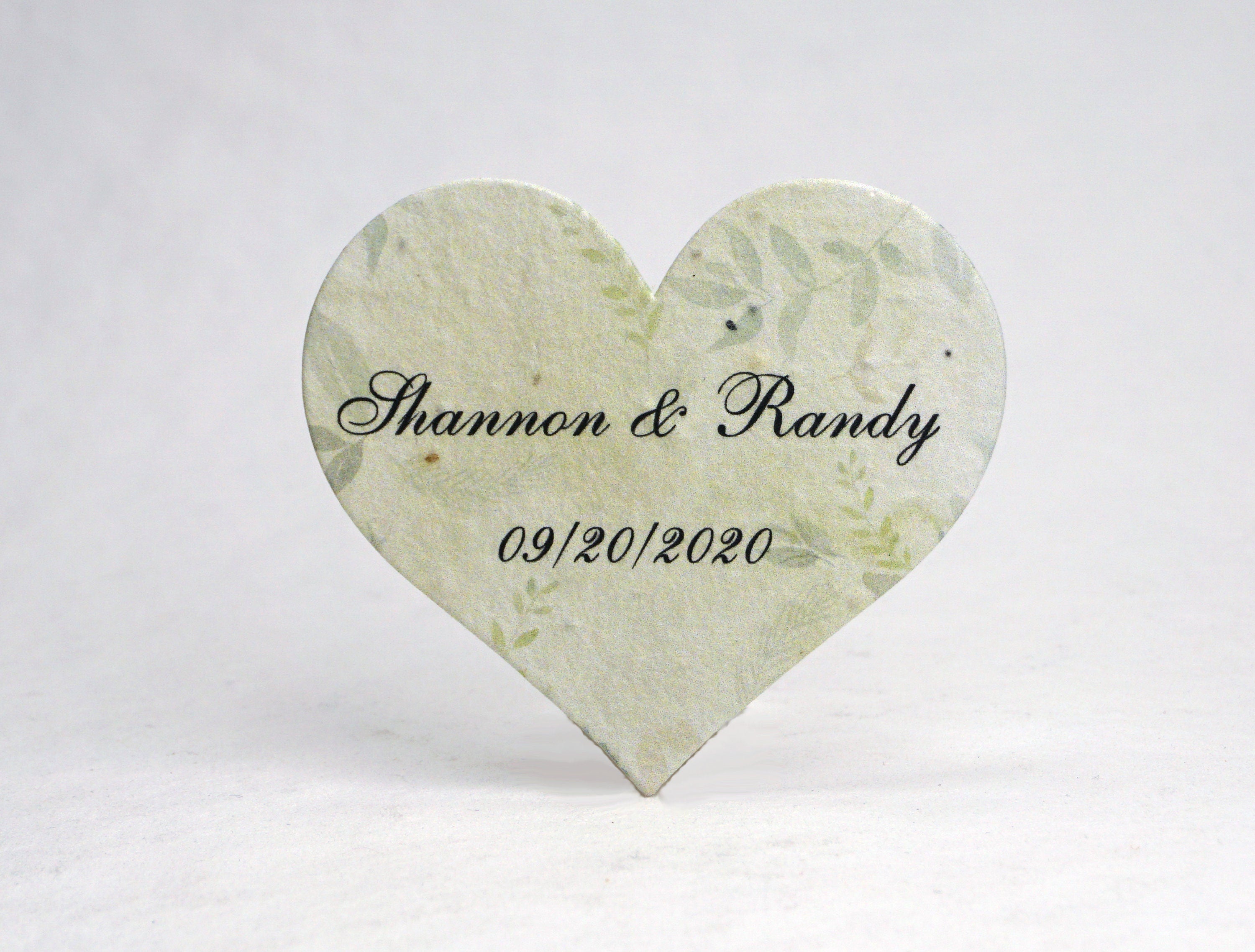 Set of 18 Large Heart shaped seed paper with your names and event date printed in black. 100% tree free cotton paper. Will sprout flowers if planted. These ship within three days of ordering. These are die cut from paper made in Seattle, Washington. They measure 2.85" wide by 2.5" tall. Our wildflower blend papers contain all of the following US origin wildflower seeds: Snapdragon (Annual), Petunia (Annual), Beardtongue (Perennial), Poppy (Annual), Mountain Mint (Perennial), Chamomile (Perennial). The plants tolerate partial shade and need 4 hours a day of direct sunlight. Will grow to about 3'. The blend of seeds we have selected to include in our papers was chosen to ensure that regardless of your growing region some of the plant seeds embedded in our paper will flourish. Germination may begin as quickly as one week or may take up to six weeks depending on your regional growing zone. If you plant this paper in a pot, or in your garden please cover with just 1/8” of soil and keep moist until established.