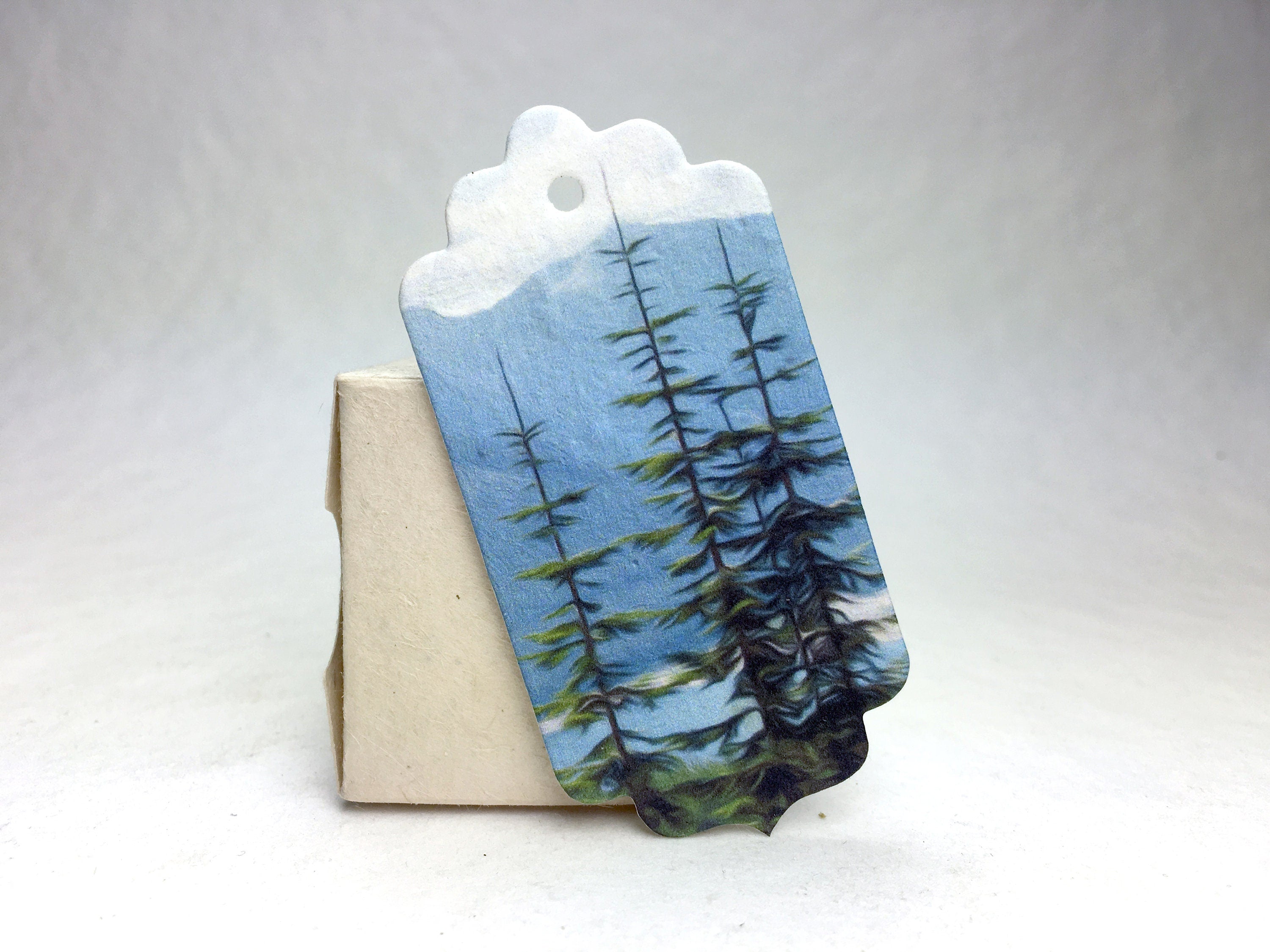 Your message will be printed in black ink on one side of the tag, and your chosen art will be printed on the other. These are die cut from paper made in Seattle, Washington.
