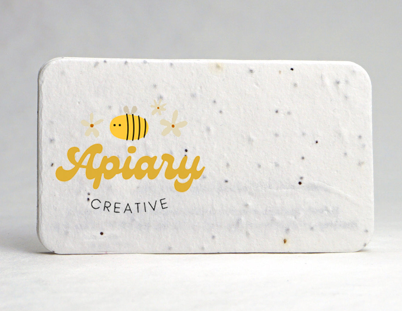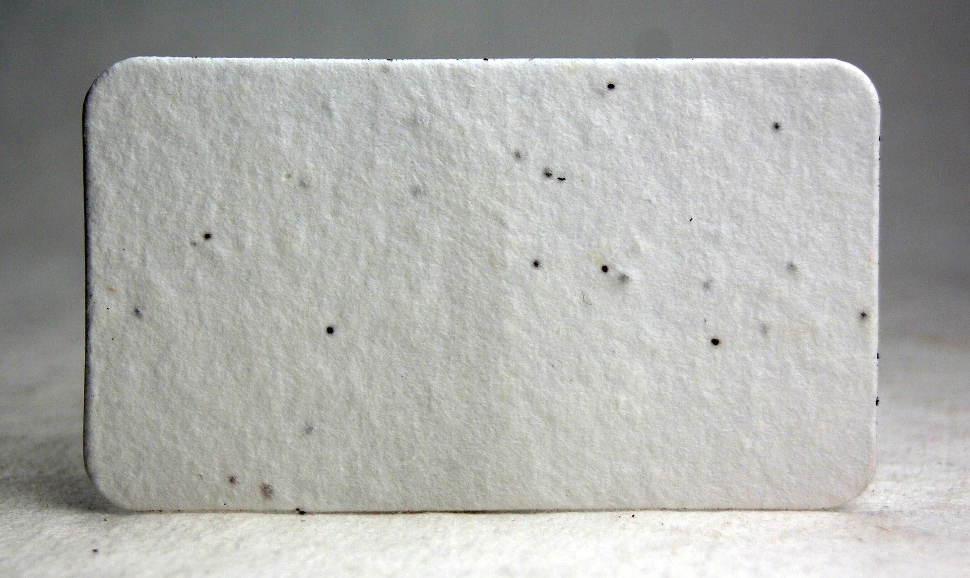 Rounded edge business card sized 3.5" x 2" inches of handmade paper containing a North American wildflower seed mix. Handmade in Seattle, Washington. This is a tree free paper that is made from natural cotton fiber which gives it a soft luxuriant feel. We make every effort to conserve water and resources in making our paper. No chemicals or other agents are added to ensure that our process is as environmentally friendly as possible.