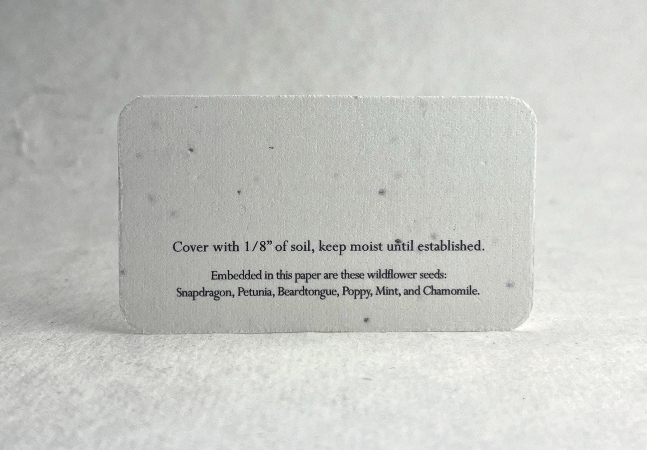The back has the following message: "Cover with 1/8” of soil, keep moist until established. Embedded in this paper are these wildflower seeds: Snapdragon, Petunia, Beardtongue, Poppy, Mint, and Chamomile."