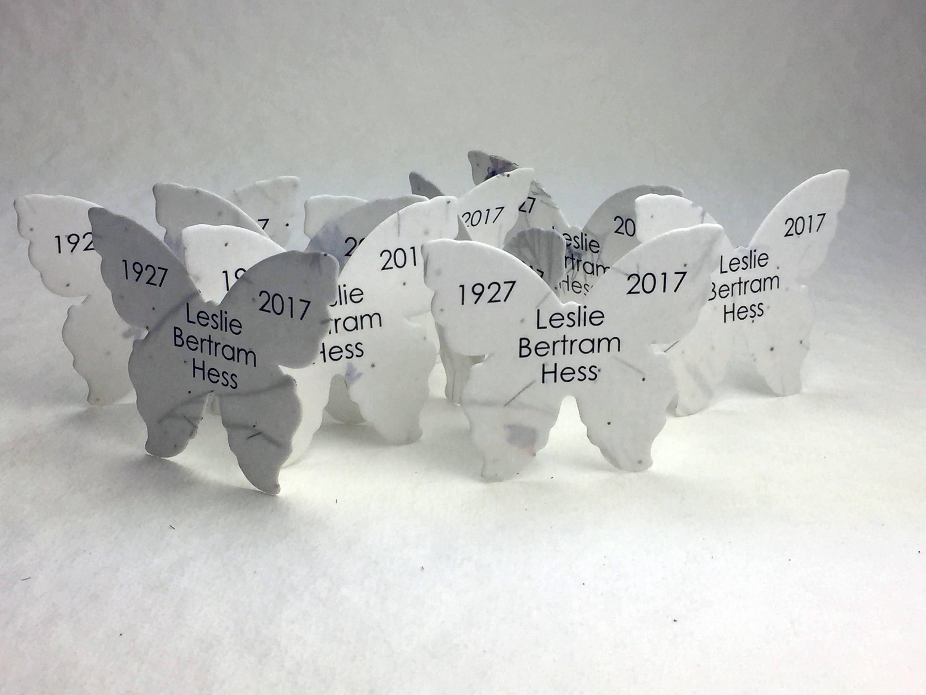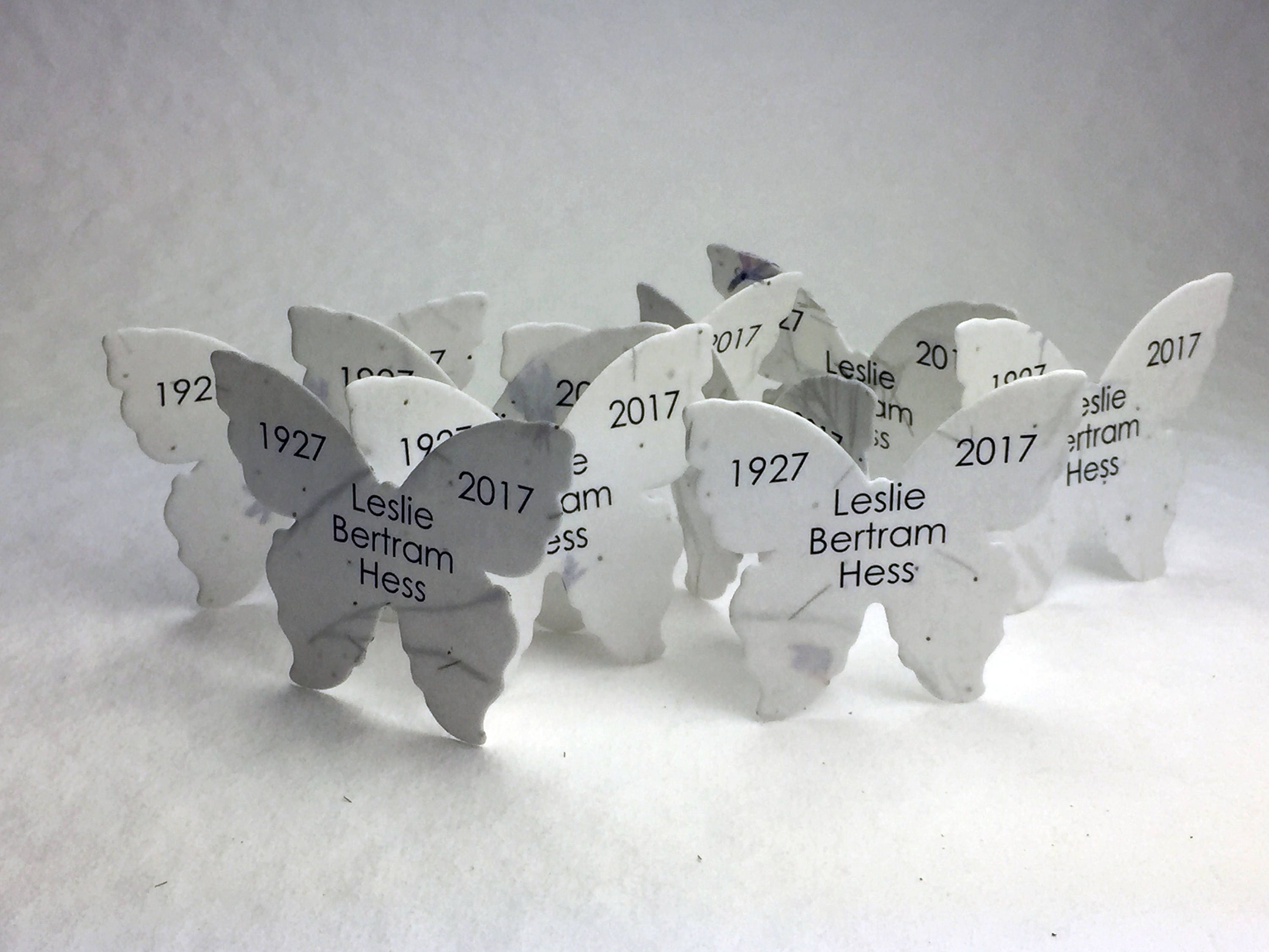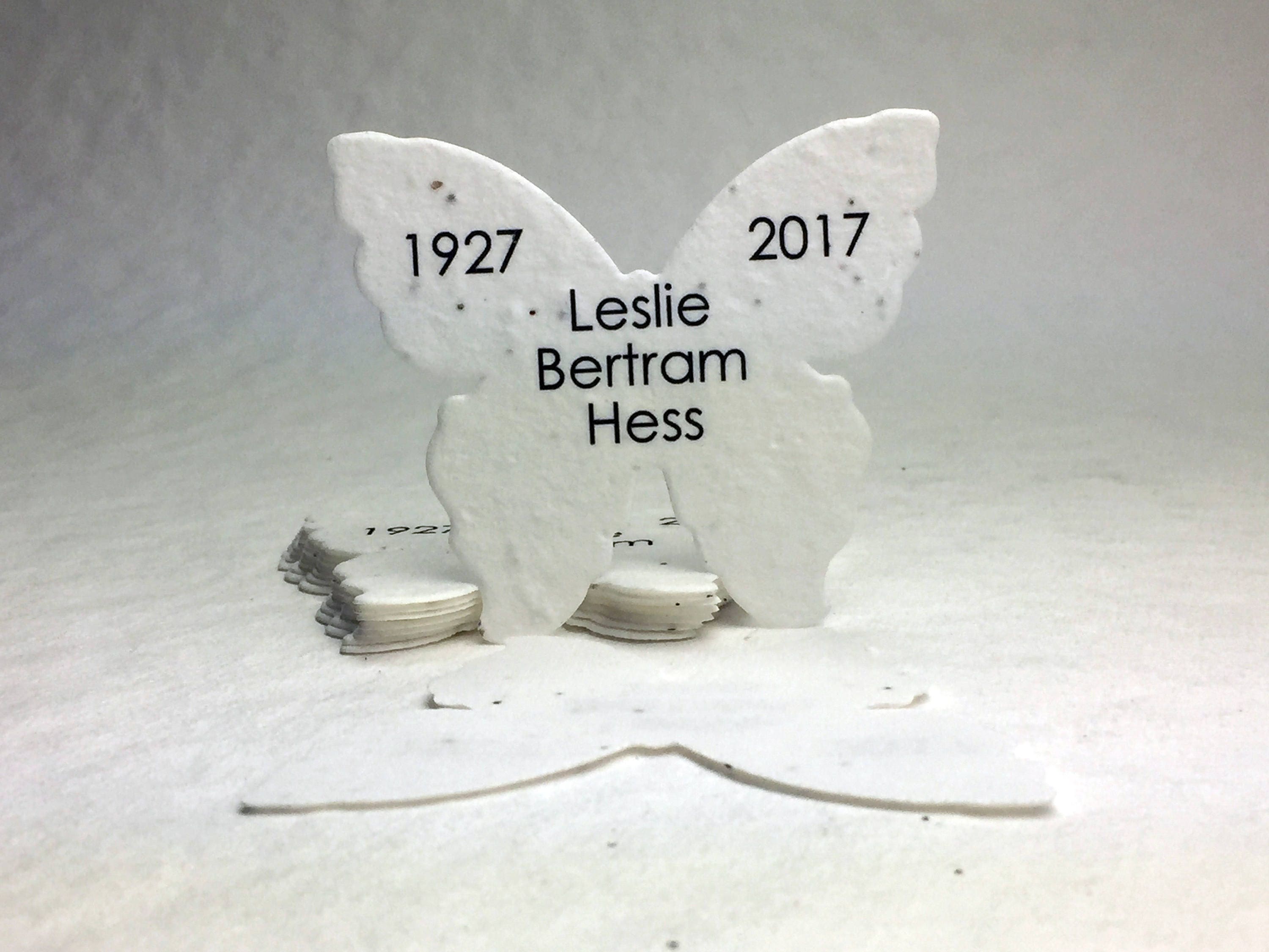 Set of 18 or 99 large butterfly seed paper shapes personalized with your loved one's name, birth and death dates printed in black. 100% tree free cotton paper. Will sprout flowers if planted. The back side is blank. The seed information and planting instructions are on the packaging.