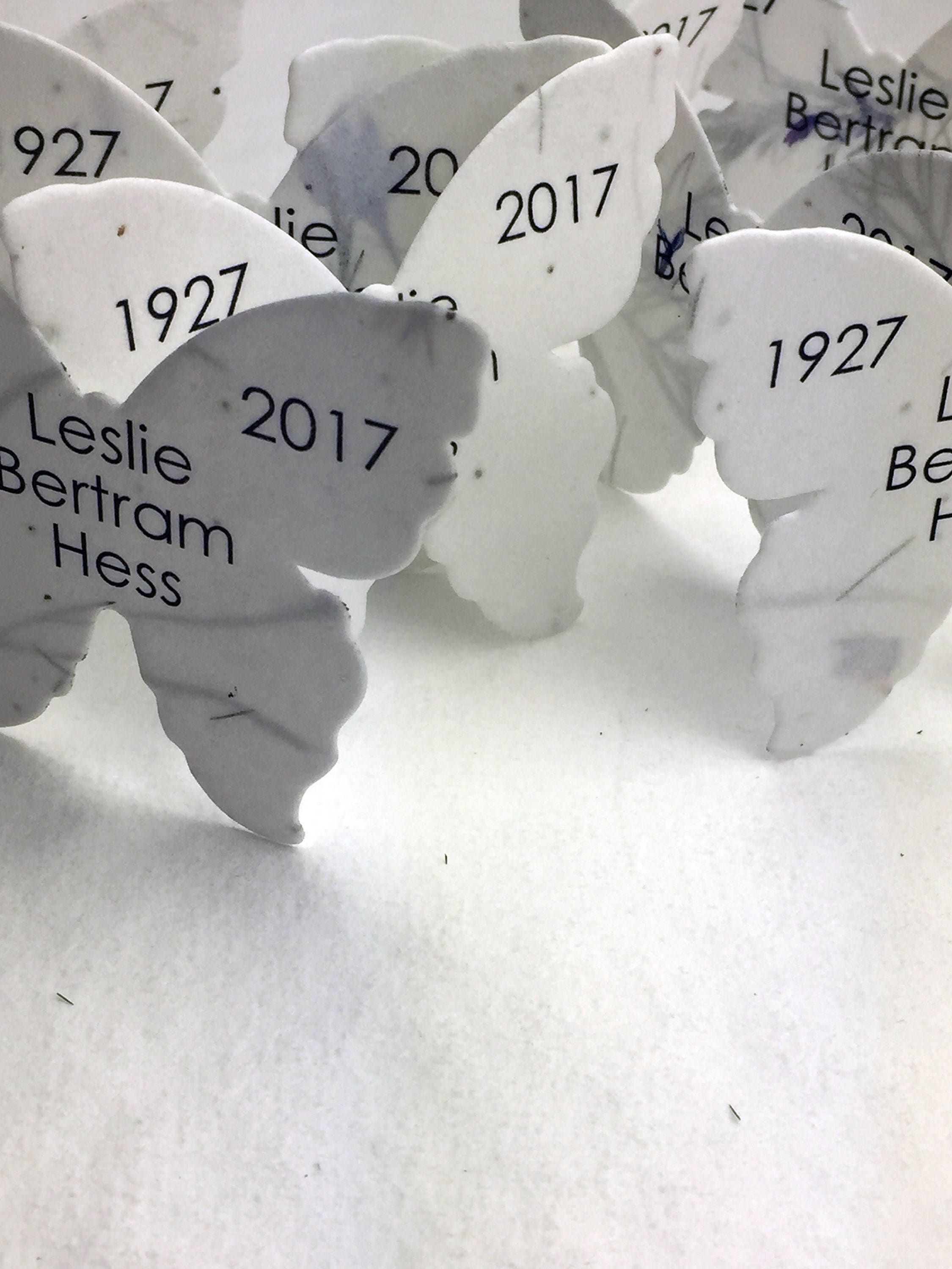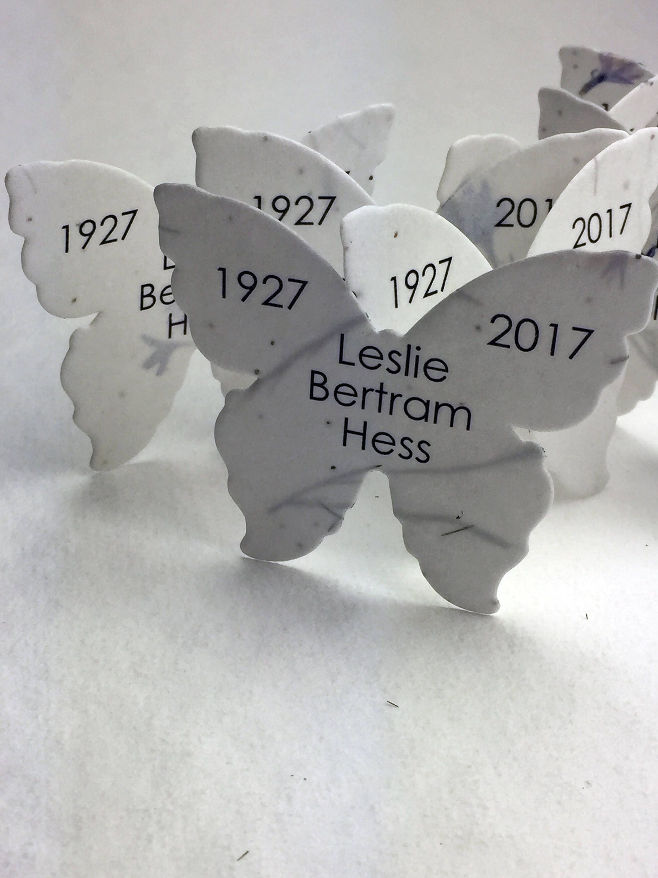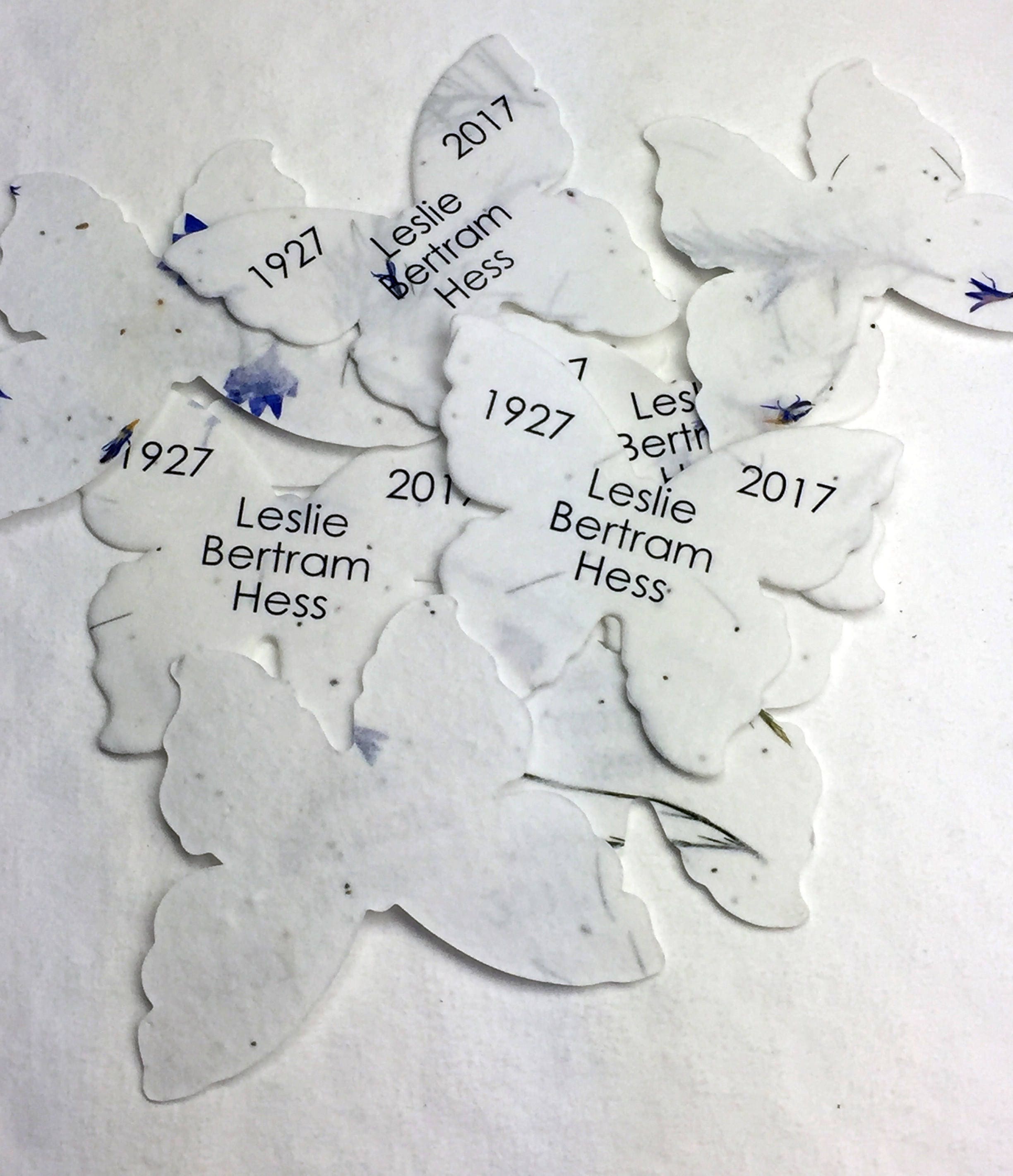 Set of 18 or 99 large butterfly seed paper shapes personalized with your loved one's name, birth and death dates printed in black. 100% tree free cotton paper. Will sprout flowers if planted. The back side is blank. The seed information and planting instructions are on the packaging.