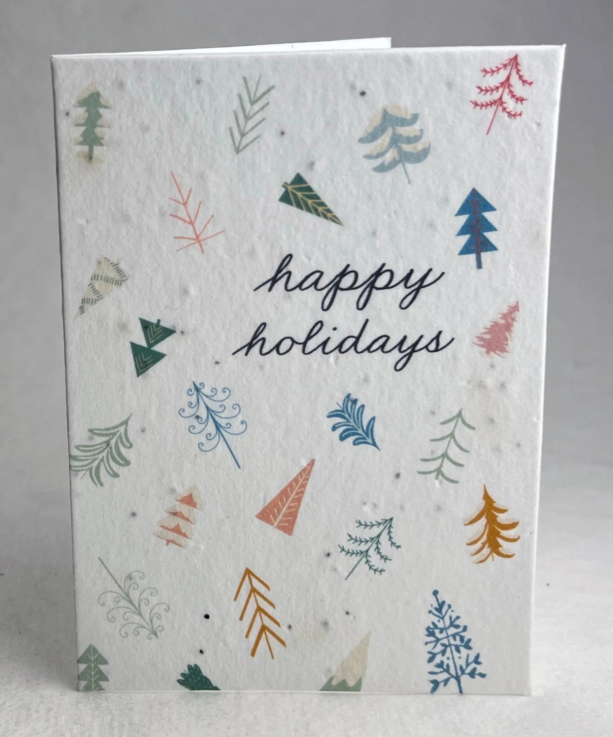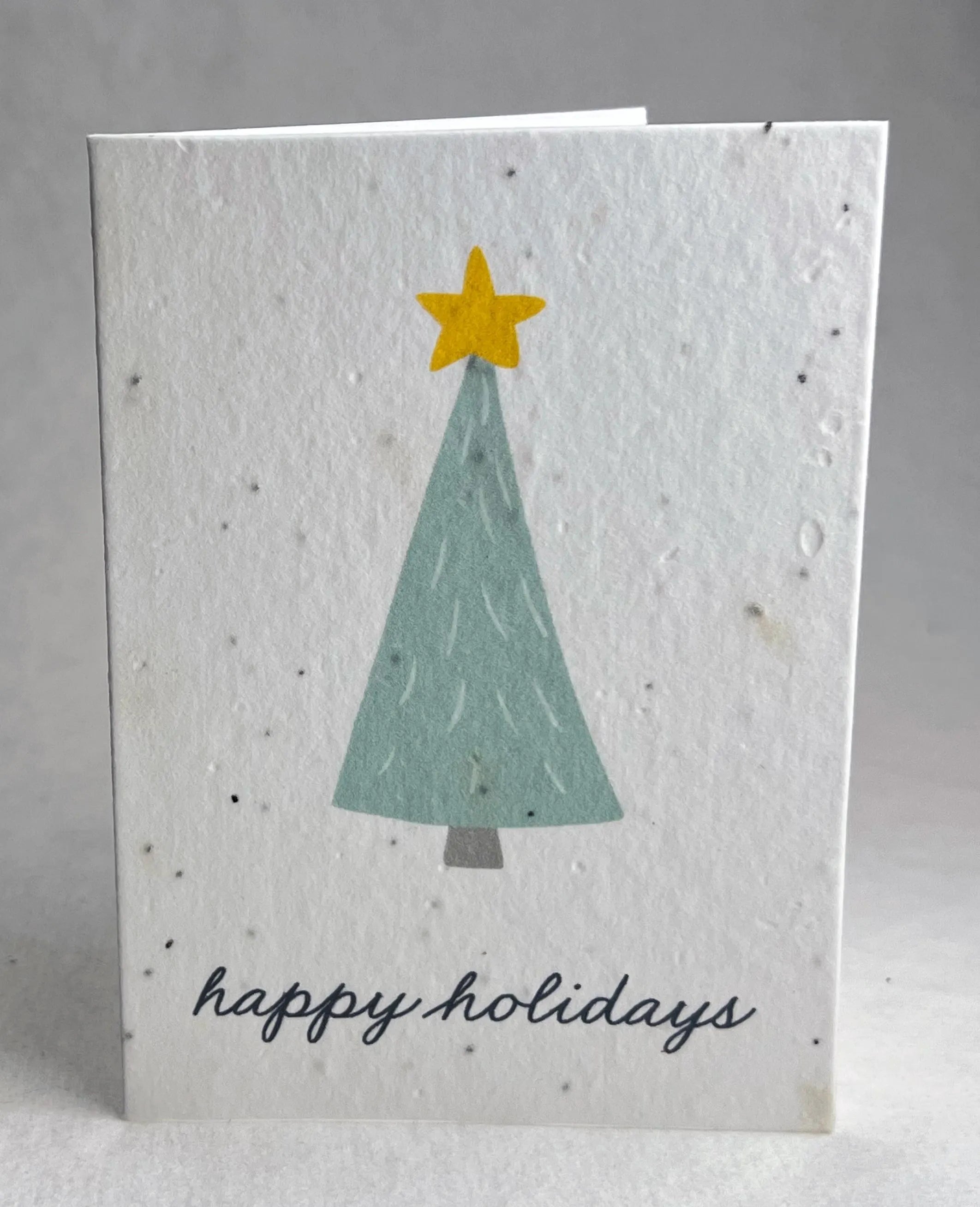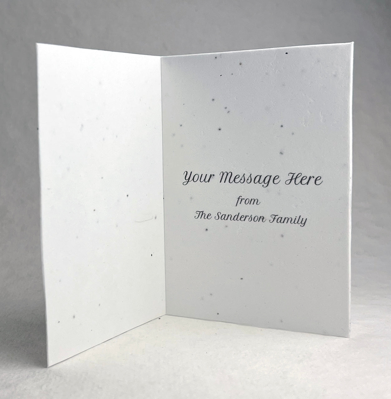 The envelope is 100% recycled paper stock. The paper is our cotton stock embedded with wildflower seeds. We use only recyclable shipping materials. The card measures 4 7/8 inches x 7 inches when open, 4 7/8 inches x 3.5 inches when closed.