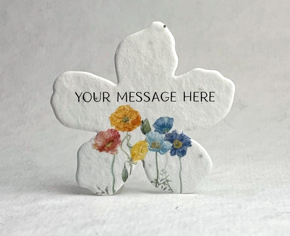 Set of 24 flower shaped seed paper die cut favor/product tags. 100% tree free cotton paper. Will sprout flowers if planted.