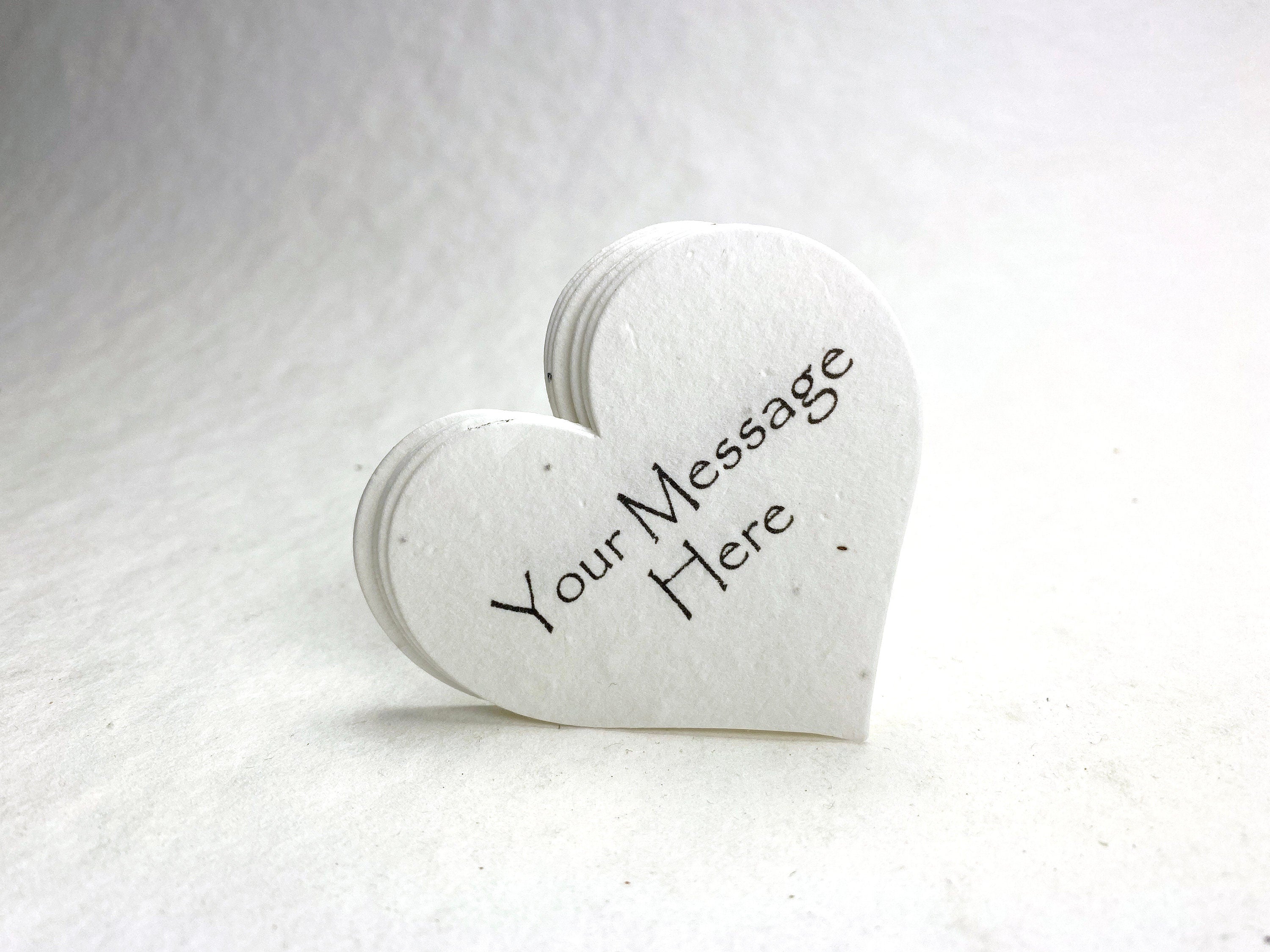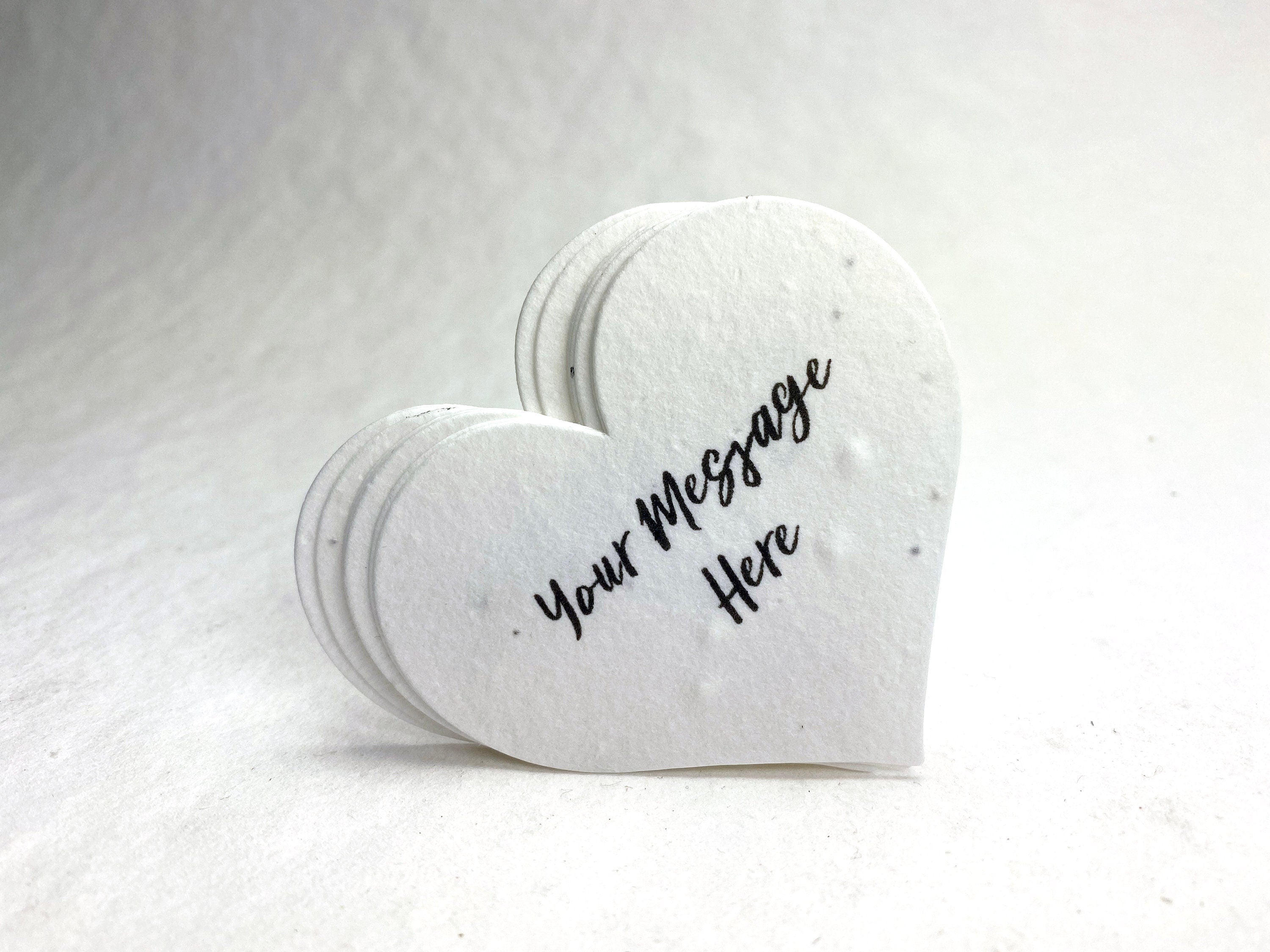 Set of 18 or 90 Large Heart shaped seed paper with your custom message printed in black. 100% tree free cotton paper. Will sprout flowers if planted. Use the last image to choose the color of paper you would like. No proof is generated, and no further customization is possible on this listing. Please contact us with customization requests! These are die cut from paper made in Seattle, Washington. They measure 2.85" wide by 2.5" tall. Our wildflower blend papers contain all of the following US origin wildflower seeds: Snapdragon (Annual), Petunia (Annual), Beardtongue (Perennial), Poppy (Annual), Mountain Mint (Perennial), Chamomile (Perennial). The plants tolerate partial shade and need 4 hours a day of direct sunlight. Will grow to about 3'. The blend of seeds we have selected to include in our papers was chosen to ensure that regardless of your growing region some of the plant seeds embedded in our paper will flourish. Germination may begin as quickly as one week or may take up to six weeks depending on your regional growing zone. If you plant this paper in a pot, or in your garden please cover with just 1/8” of soil and keep moist until established.