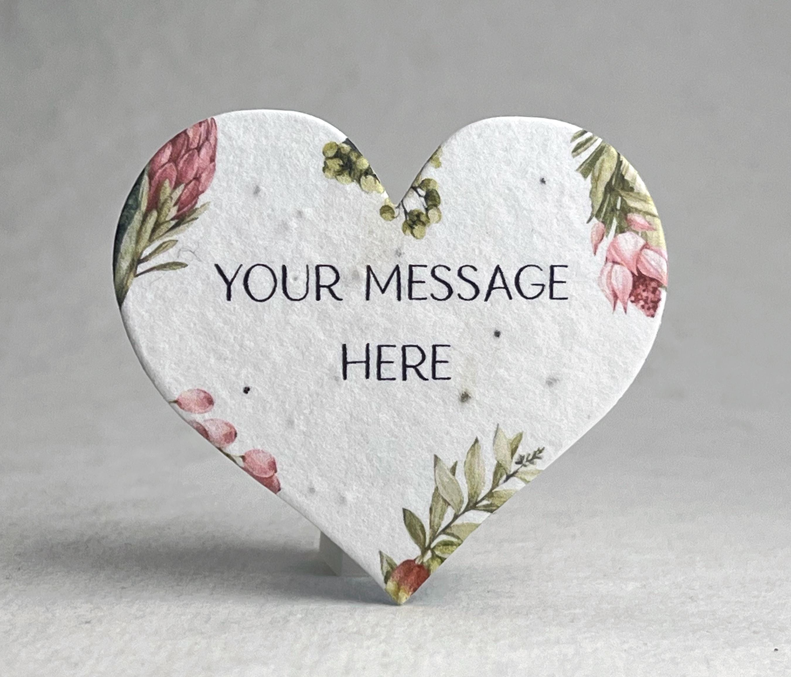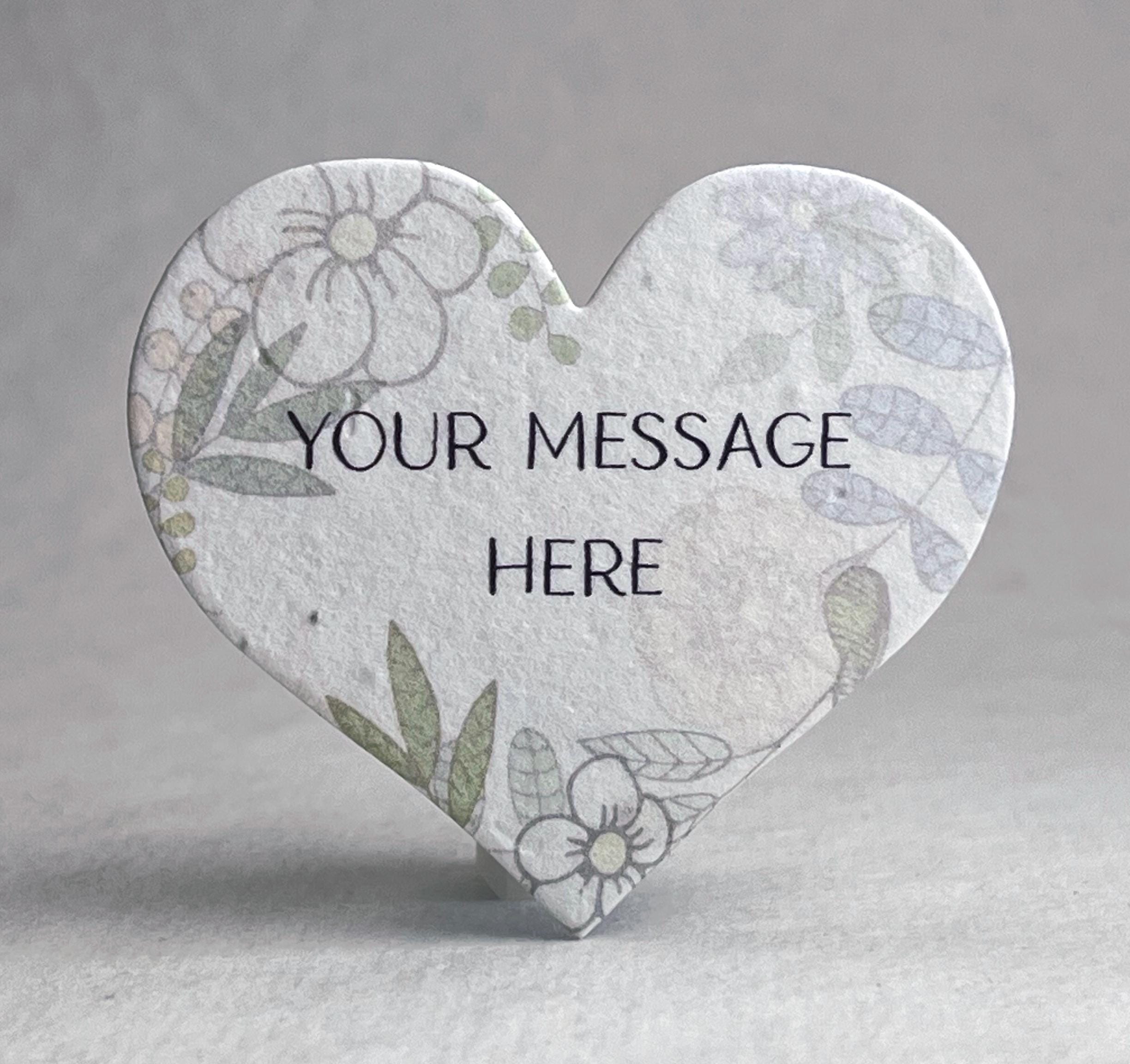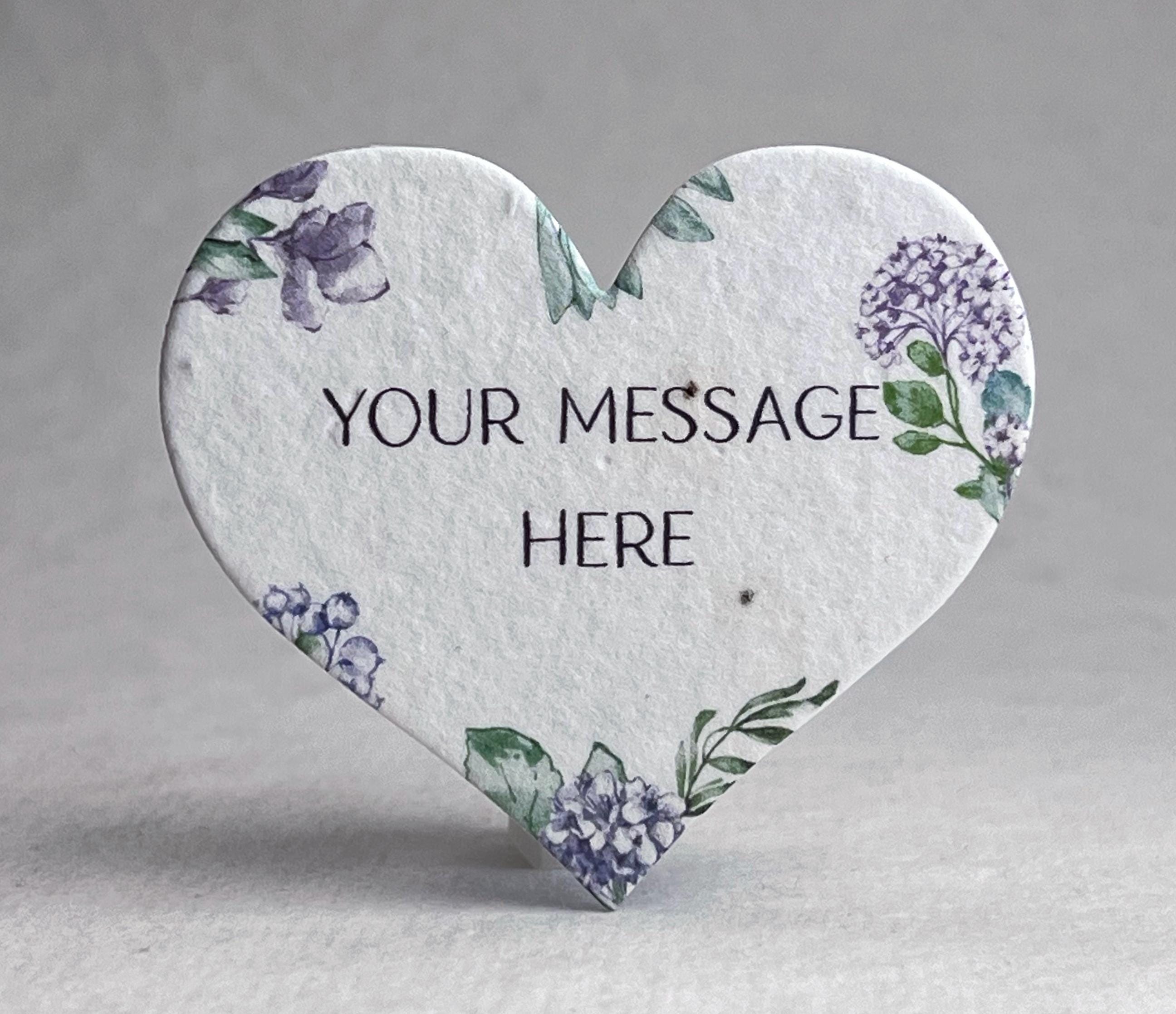 Set of 18 Large Heart shaped seed paper with your custom message. 100% tree free cotton paper. Will sprout flowers if planted. No proof is generated, and no further customization is possible on this listing. Please contact us with customization requests! These are die cut from paper made in Seattle, Washington. They measure 2.85" wide by 2.5" tall. Our wildflower blend papers contain all of the following US origin wildflower seeds: Snapdragon (Annual), Petunia (Annual), Beardtongue (Perennial), Poppy (Annual), Mountain Mint (Perennial), Chamomile (Perennial). The plants tolerate partial shade and need 4 hours a day of direct sunlight. Will grow to about 3'. The blend of seeds we have selected to include in our papers was chosen to ensure that regardless of your growing region some of the plant seeds embedded in our paper will flourish. Germination may begin as quickly as one week or may take up to six weeks depending on your regional growing zone. If you plant this paper in a pot, or in your garden please cover with just 1/8” of soil and keep moist until established.
